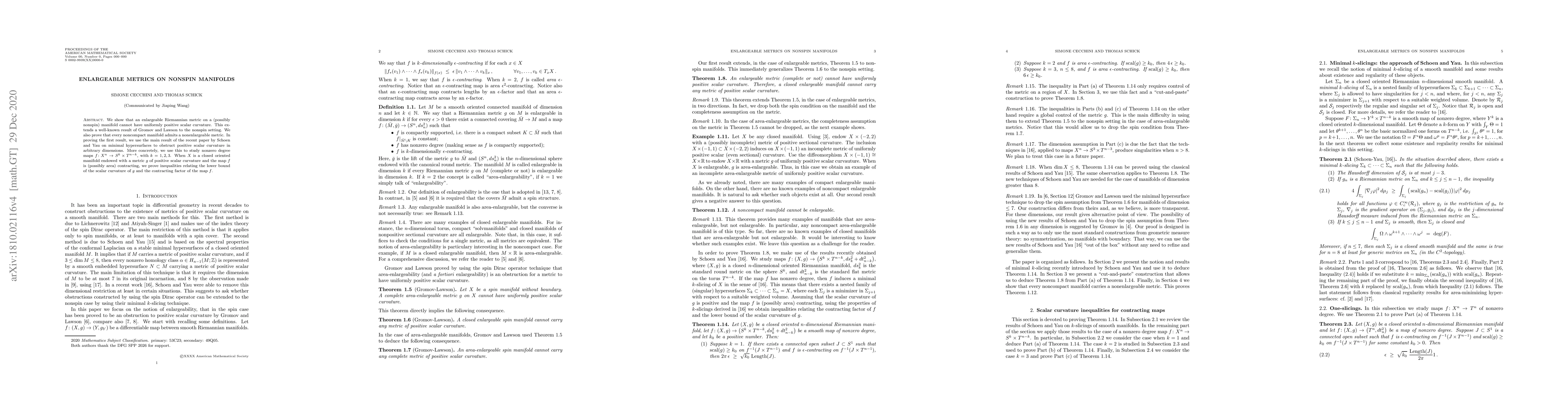 This paper demonstrates that an enlargeable Riemannian metric on a nonspin manifold cannot have uniformly positive scalar curvature, extending Gromov and Lawson's result. It also proves that every noncompact manifold can have a nonenlargeable metric, using Schoen and Yau's work on minimal hypersurfaces to obstruct positive scalar curvature.