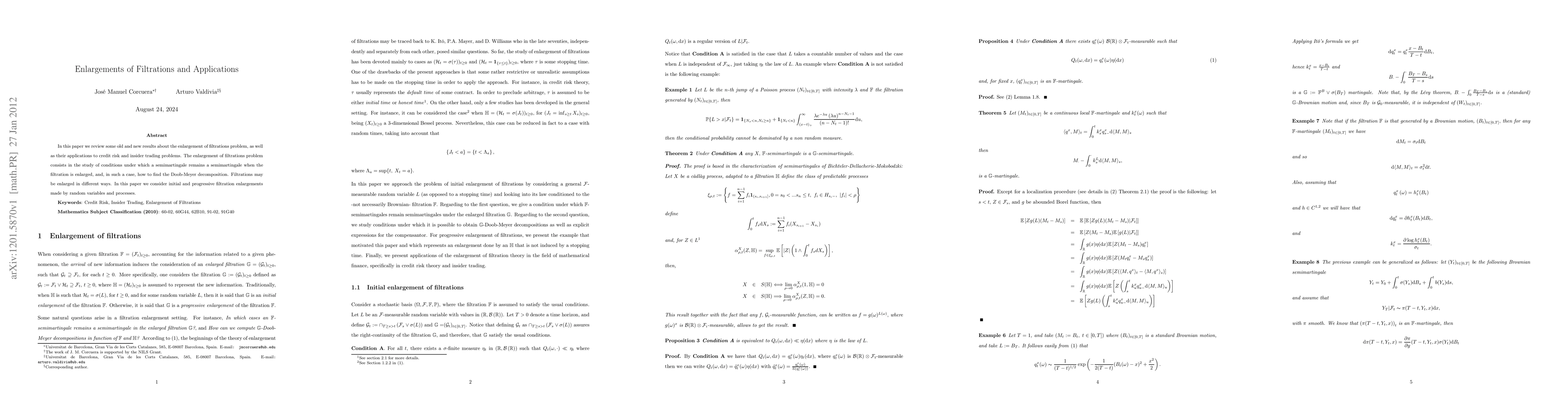 This paper reviews both historical and recent findings on the enlargement of filtrations, focusing on conditions that maintain semimartingale properties and the associated Doob-Meyer decomposition. It applies these concepts to credit risk and insider trading scenarios.
