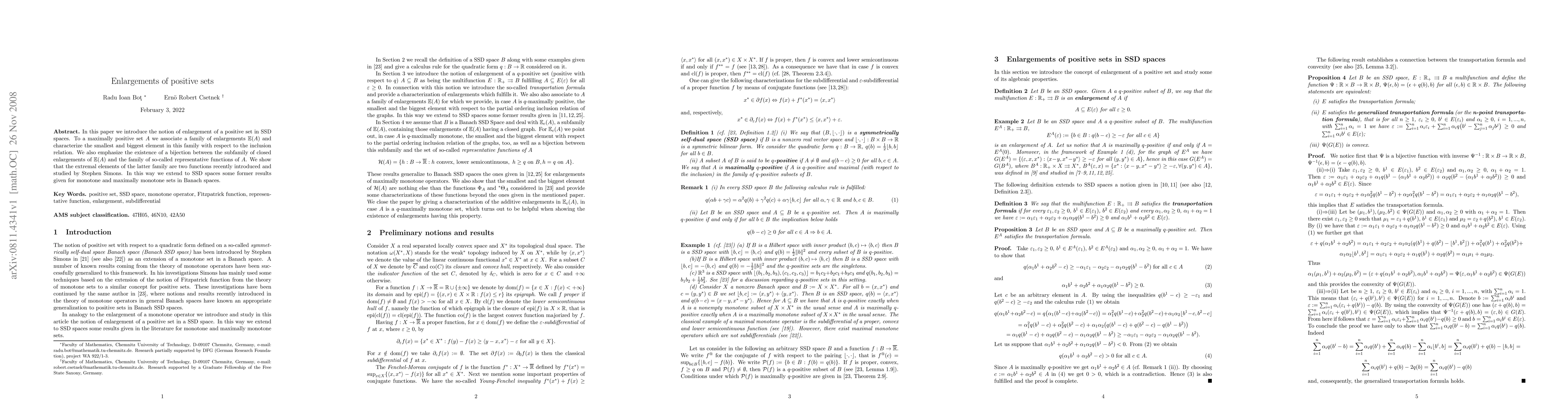 In this paper we introduce the notion of enlargement of a positive set in SSD spaces. To a maximally positive set $A$ we associate a family of enlargements $\E(A)$ and characterize the smallest and biggest element in this family with respect to the inclusion relation. We also emphasize the existence of a bijection between the subfamily of closed enlargements of $\E(A)$ and the family of so-called representative functions of $A$. We show that the extremal elements of the latter family are two functions recently introduced and studied by Stephen Simons. In this way we extend to SSD spaces some former results given for monotone and maximally monotone sets in Banach spaces.
