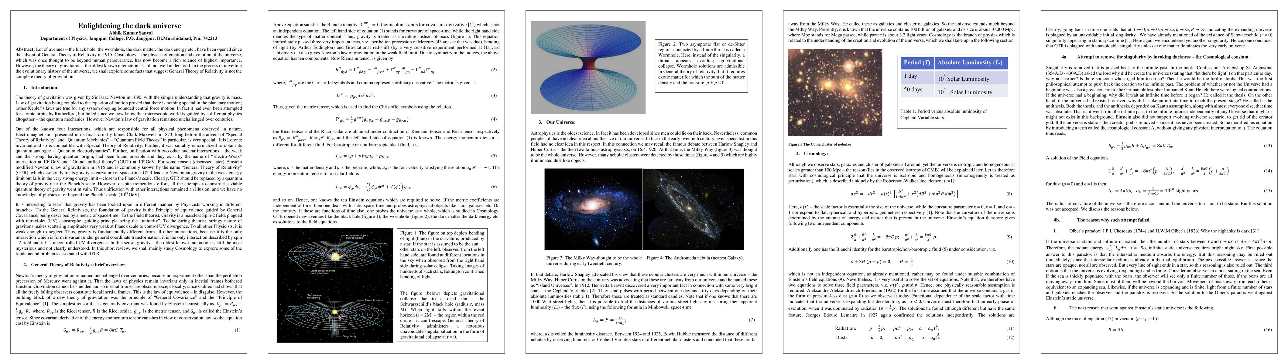 Lot of avenues, the black hole, the wormhole, the dark matter, the dark energy etc. have been opened since the advent of General Theory of Relativity in 1915. Cosmology, the physics of creation and evolution of the universe, which was once thought to be beyond human perseverance, has now become a rich science of highest importance. However, the theory of gravitation, the oldest known interaction, is still not well understood. In the process of unveiling the evolutionary history of the universe, we shall explore some facts that suggest General Theory of Relativity is not the complete theory of gravitation.