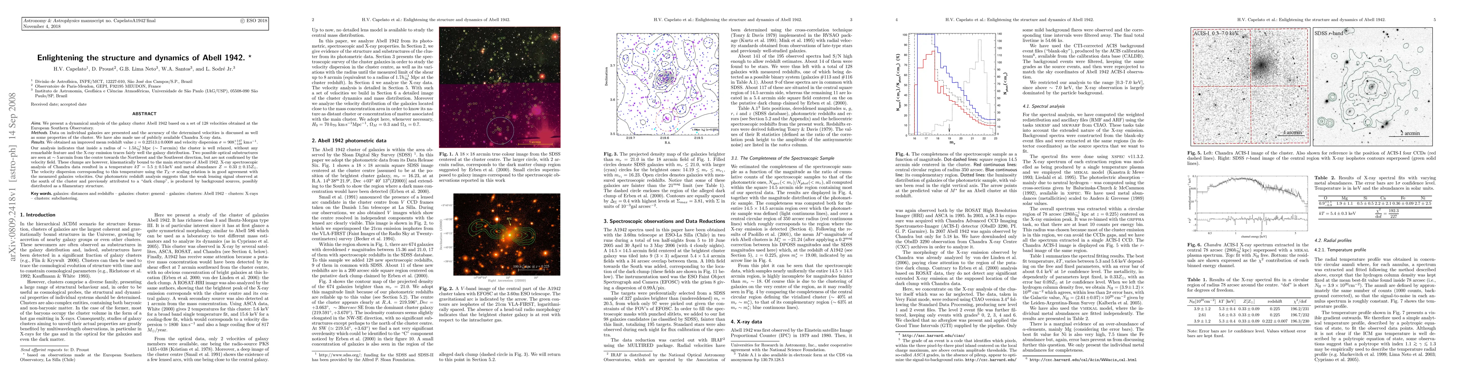 The research analyzes galaxy cluster Abell 1942 using 128 velocity measurements and Chandra X-ray data, determining an improved mean redshift (z = 0.22513) and velocity dispersion (sigma = 908 km/s). It finds the cluster relaxed within ~1.5 Mpc, with X-ray emission following galaxy distribution. Two potential optical substructures are noted but not confirmed by velocity data; they remain kinematically bound. X-ray spectroscopy yields a temperature (kT = 5.5 keV) and metal abundance (Z = 0.33 Z_odot). The study concludes that a previously attributed 'dark clump' south of the cluster is likely a filamentary structure of background sources.