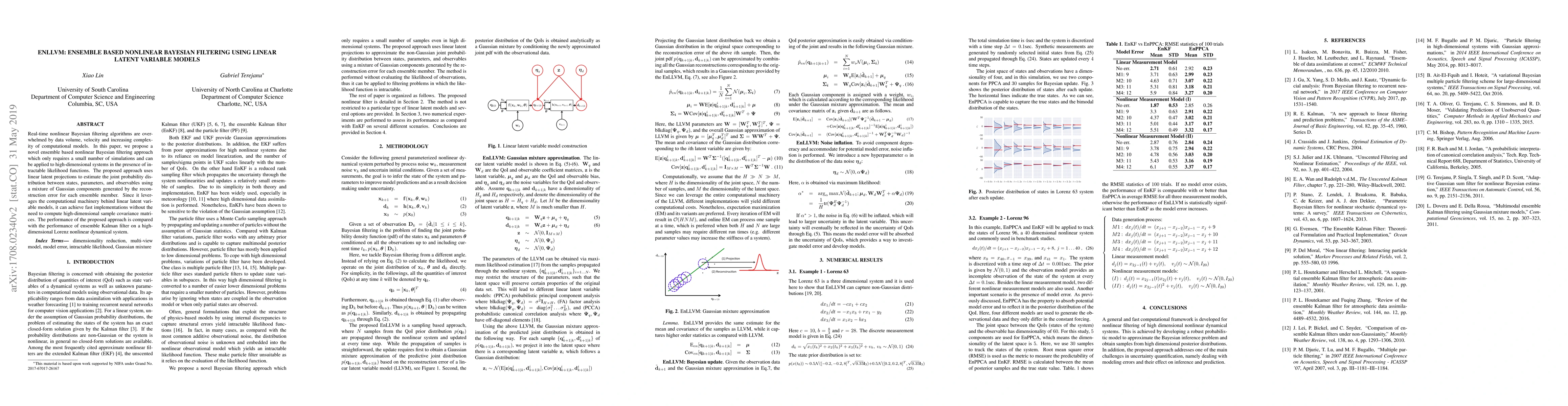 This paper introduces an ensemble-based nonlinear Bayesian filtering method that employs linear latent variable models to efficiently handle high-dimensional systems with intractable likelihood functions. The approach uses a mixture of Gaussian components generated by ensemble reconstruction errors, achieving fast computation without the need for high-dimensional sample covariance matrices.
