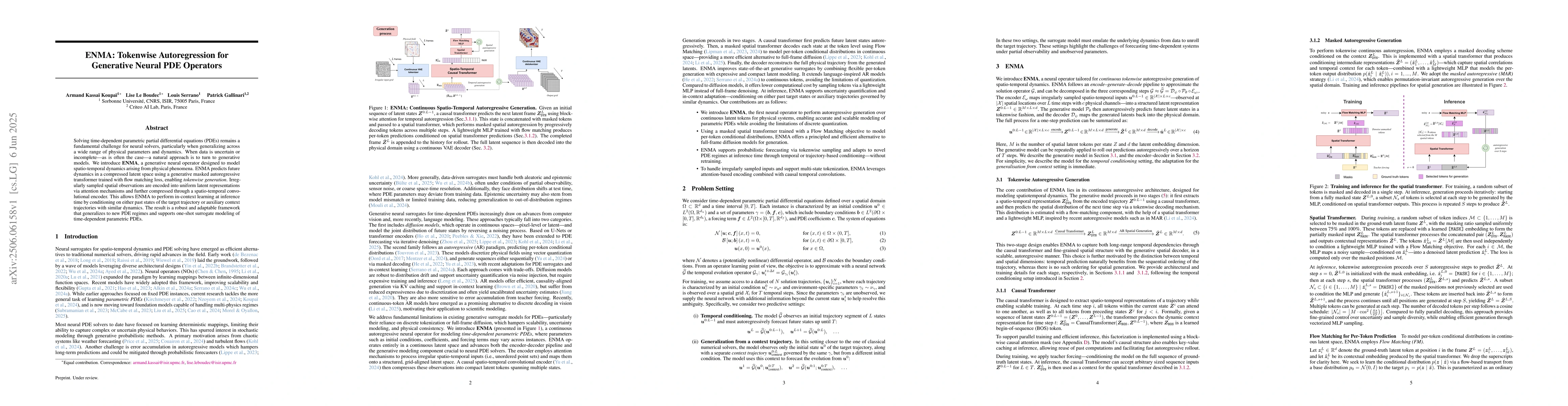 The research introduces ENMA, a generative neural operator that models spatio-temporal dynamics from physical phenomena. ENMA uses a masked autoregressive transformer, trained with flow matching loss, to predict future dynamics in a compressed latent space. It handles irregularly sampled spatial observations and supports one-shot surrogate modeling of time-dependent parametric PDEs, demonstrating robust generalization across various PDE regimes.