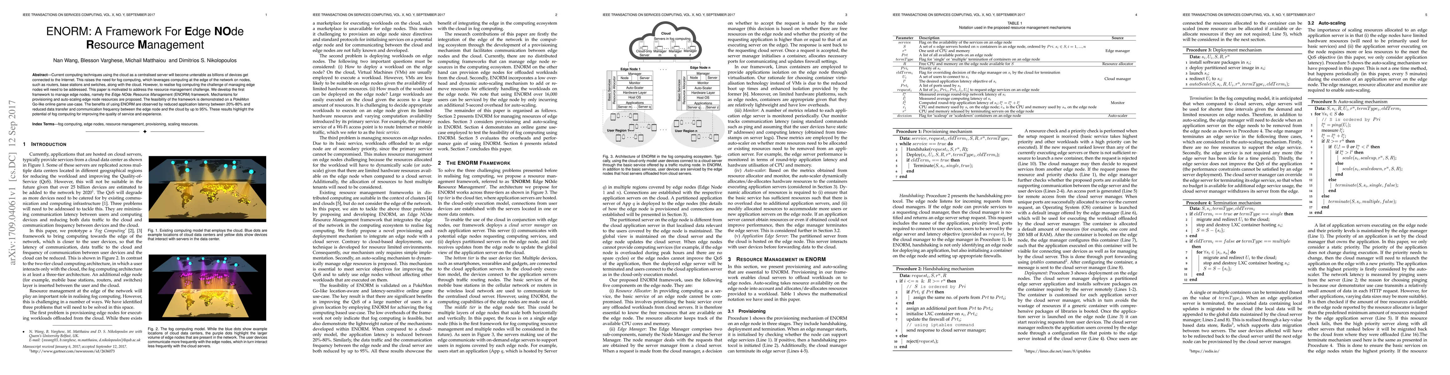 The ENORM framework addresses the resource management challenge in fog computing by proposing mechanisms for edge node provisioning and auto-scaling. Demonstrated through a PokeMon Go-like game, ENORM reduces application latency by 20%-80% and cuts data transfer frequency by up to 95%.