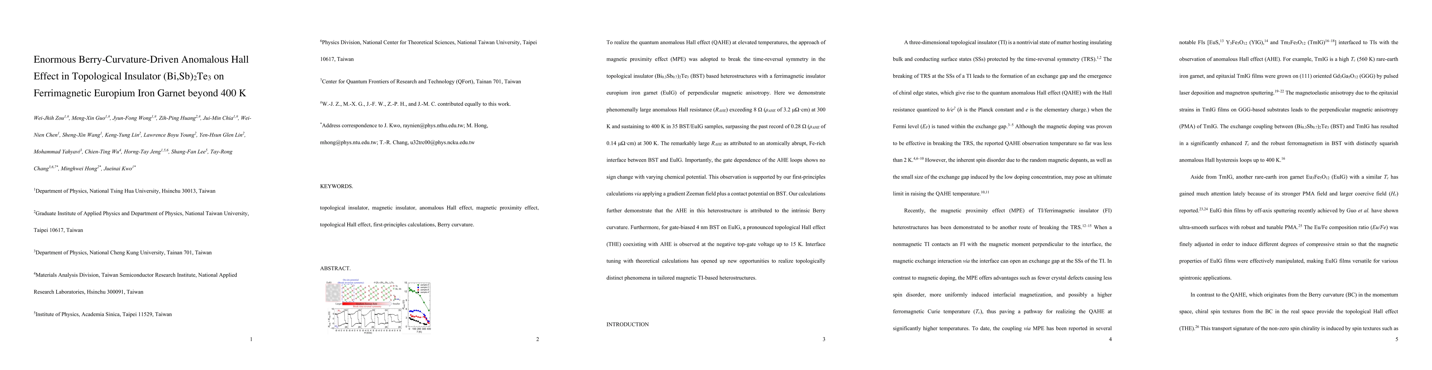 This research presents a significant breakthrough in realizing a large anomalous Hall effect (AHE) at high temperatures (up to 400 K) in a topological insulator (BST) on a ferrimagnetic insulator (EuIG). The AHE, attributed to intrinsic Berry curvature, surpasses previous records. The study also reveals a topological Hall effect (THE) at negative top-gate voltages, demonstrating potential for tailored magnetic topological insulator heterostructures.