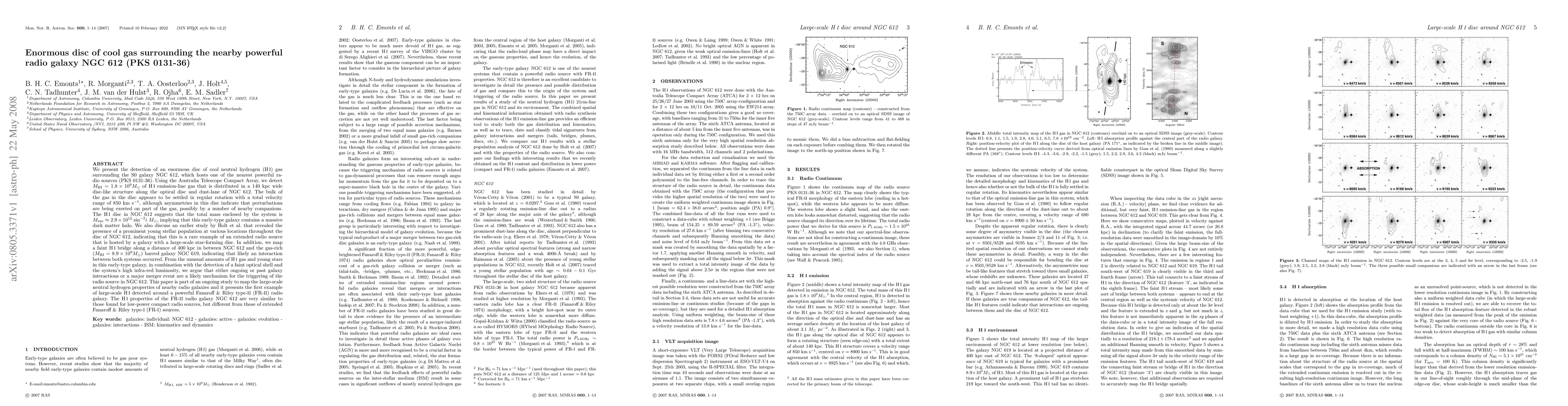 We present the detection of an enormous disc of cool neutral hydrogen (HI) gas surrounding the S0 galaxy NGC 612, which hosts one of the nearest powerful radio sources (PKS 0131-36). Using the Australia Telescope Compact Array, we detect M_HI = 1.8 x 10^9 M_sun of HI emission-line gas that is distributed in a 140 kpc wide disc-like structure along the optical disc and dust-lane of NGC 612. The bulk of the gas in the disc appears to be settled in regular rotation with a total velocity range of 850 km/s, although asymmetries in this disc indicate that perturbations are being exerted on part of the gas, possibly by a number of nearby companions. The HI disc in NGC 612 suggests that the total mass enclosed by the system is M_enc ~ 2.9 x 10^12 sin^-2(i) M_sun, implying that this early-type galaxy contains a massive dark matter halo. We also discuss an earlier study by Holt et al. that revealed the presence of a prominent young stellar population at various locations throughout the disc of NGC 612, indicating that this is a rare example of an extended radio source that is hosted by a galaxy with a large-scale star-forming disc. In addition, we map a faint HI bridge along a distance of 400 kpc in between NGC 612 and the gas-rich (M_HI = 8.9 x 10^9 M_sun) barred galaxy NGC 619, indicating that likely an interaction between both systems occurred. From the unusual amounts of HI gas and young stars in this early-type galaxy, in combination with the detection of a faint optical shell and the system's high infra-red luminosity, we argue that either ongoing or past galaxy interactions or a major merger event are a likely mechanism for the triggering of the radio source in NGC 612. This paper is part of an ongoing study to map the large-scale neutral hydrogen properties of nearby radio galaxies. --abridged--