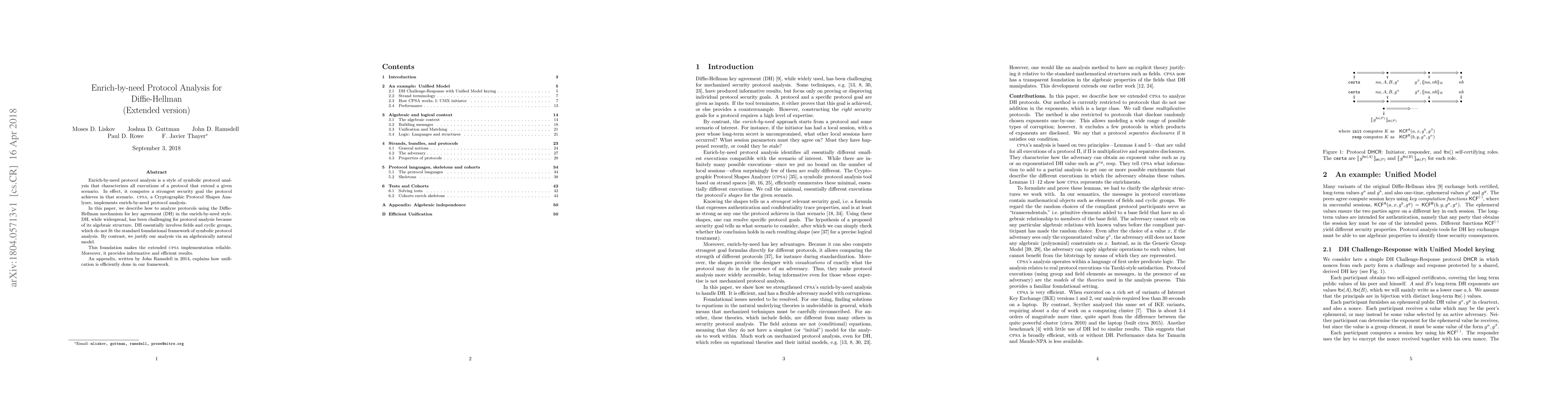 Enrich-by-need protocol analysis is a style of symbolic protocol analysis that characterizes all executions of a protocol that extend a given scenario. In effect, it computes a strongest security goal the protocol achieves in that scenario. CPSA, a Cryptographic Protocol Shapes Analyzer, implements enrich-by-need protocol analysis. In this paper, we describe how to analyze protocols using the Diffie-Hellman mechanism for key agreement (DH) in the enrich-by-need style. DH, while widespread, has been challenging for protocol analysis because of its algebraic structure. DH essentially involves fields and cyclic groups, which do not fit the standard foundational framework of symbolic protocol analysis. By contrast, we justify our analysis via an algebraically natural model. This foundation makes the extended CPSA implementation reliable. Moreover, it provides informative and efficient results. An appendix explains how unification is efficiently done in our framework.