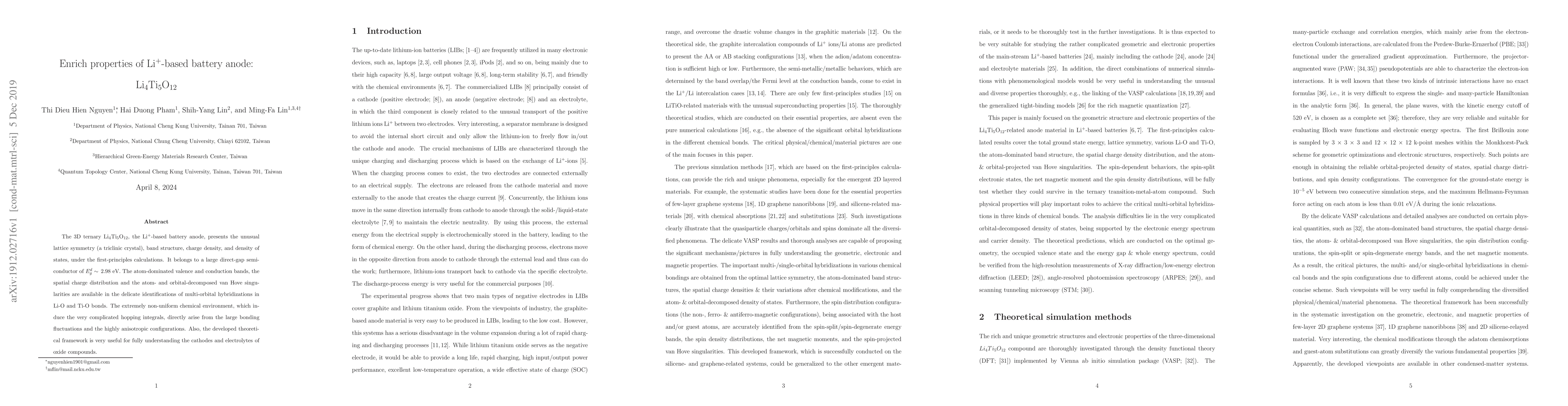 The 3D ternary Li_4Ti_5O_12, the Li+-based battery anode, presents the unusual lattice symmetry (a triclinic crystal), band structure, charge density, and density of states, under the first-principles calculations. It belongs to a large direct-gap semiconductor of E_g^d~ 2,98 eV. The atom-dominated valence and conduction bands, the spatial charge distribution and the atom- and orbital-decomposed van Hove singularities are available in the delicate identifications of multi-orbital hybridizations in Li-O and Ti-O bonds. The extremely non-uniform chemical environment, which induce the very complicated hopping integrals, directly arise from the large bonding fluctuations and the highly anisotropic configurations. Also, the developed theoretical framework is very useful for fully understanding the cathodes and electrolytes of oxide compounds.