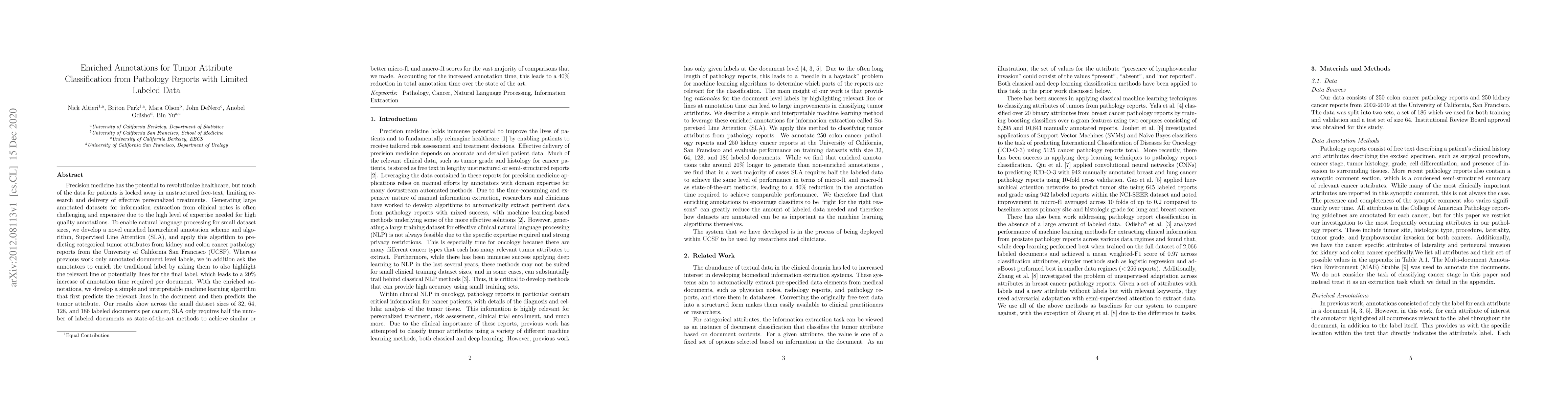 The paper presents a novel enriched hierarchical annotation scheme, Supervised Line Attention (SLA), for predicting categorical tumor attributes from pathology reports with limited labeled data. SLA involves annotators highlighting relevant lines in addition to document-level labels, increasing annotation time by 20% but improving performance significantly.