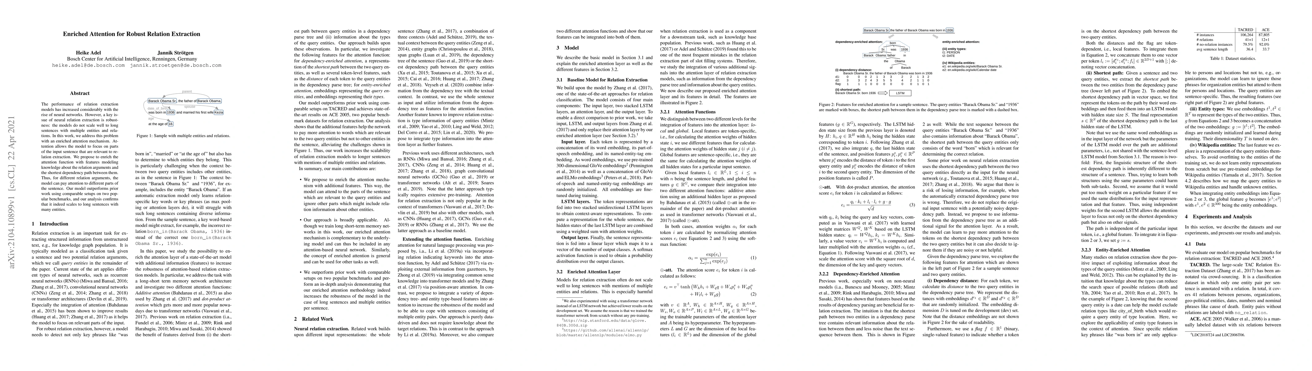 This paper introduces an enriched attention mechanism to enhance the robustness of neural relation extraction models, enabling them to better handle long sentences with multiple entities and relations. The model's attention function is enhanced with features that model knowledge about the relation arguments and their dependency paths, allowing it to outperform prior work on benchmark datasets.