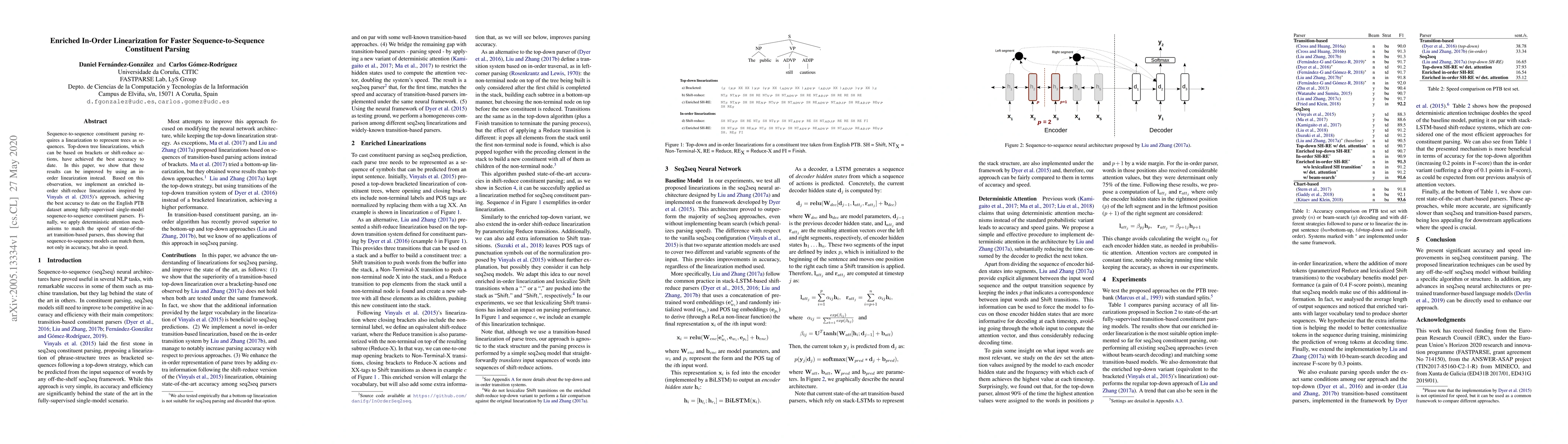 This paper proposes an enriched in-order linearization for sequence-to-sequence constituent parsing, achieving superior accuracy on the English PTB dataset compared to top-down methods. It also introduces deterministic attention mechanisms to match the speed of transition-based parsers, demonstrating that sequence-to-sequence models can rival them in both speed and accuracy.