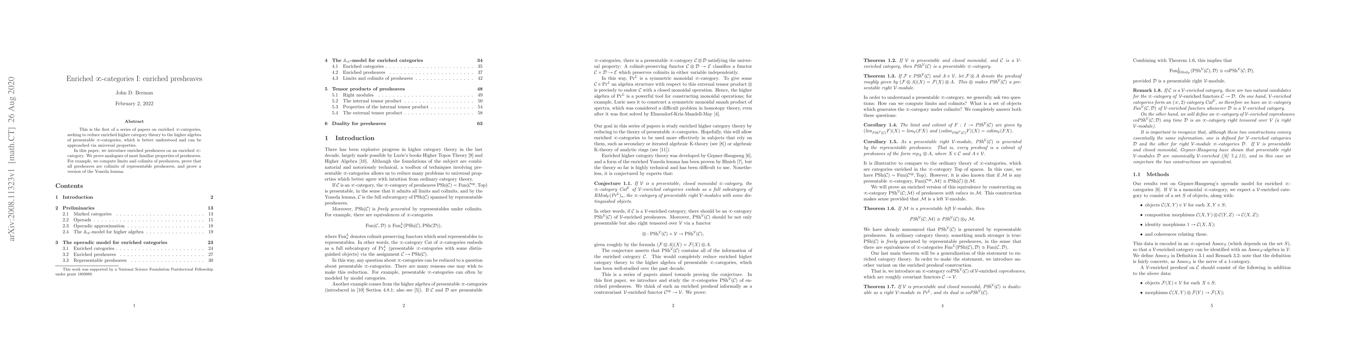 This is the first of a series of papers on enriched infinity categories, seeking to reduce enriched higher category theory to the higher algebra of presentable infinity categories, which is better understood and can be approached via universal properties. In this paper, we introduce enriched presheaves on an enriched infinity category. We prove analogues of most familiar properties of presheaves. For example, we compute limits and colimits of presheaves, prove that all presheaves are colimits of representable presheaves, and prove a version of the Yoneda lemma.