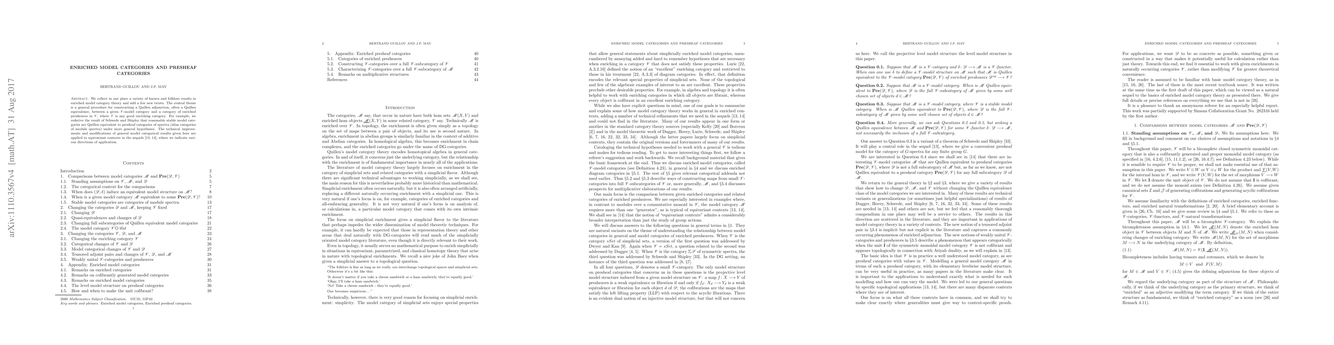 This paper consolidates various results in enriched model category theory and introduces new procedures for constructing Quillen adjunctions between V-model categories and enriched presheaf categories, extending prior work on stable model categories and spectra. The findings lay groundwork for future applications in equivariant contexts.