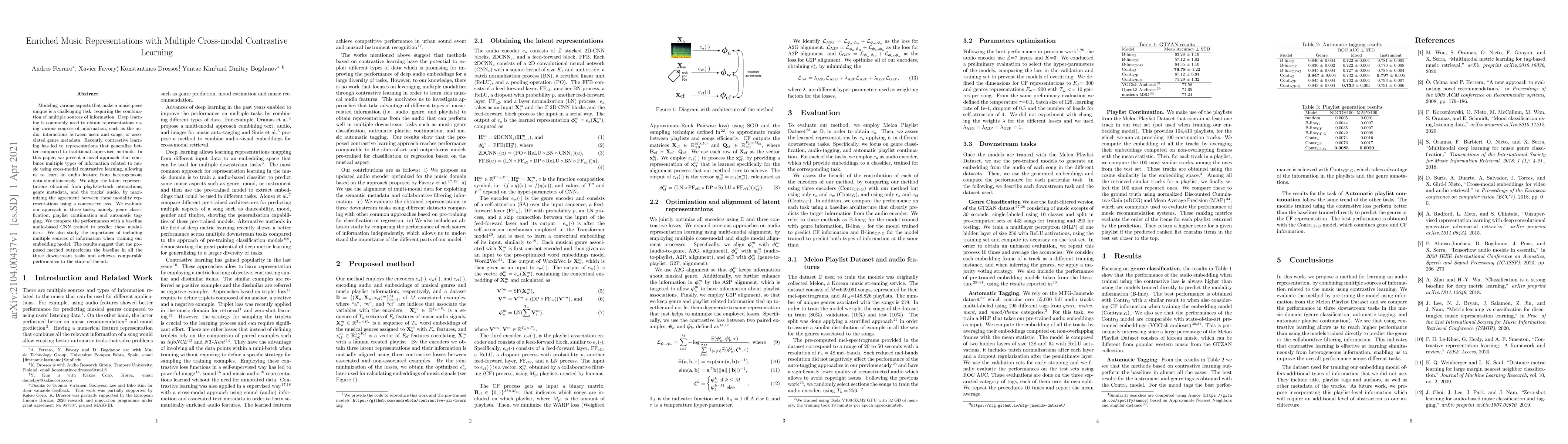 This paper introduces a cross-modal contrastive learning approach to enrich music representations by integrating audio, user interactions, and genre metadata. The method outperforms an audio-based CNN baseline in genre classification, playlist continuation, and automatic tagging, demonstrating the value of combining multiple information sources.