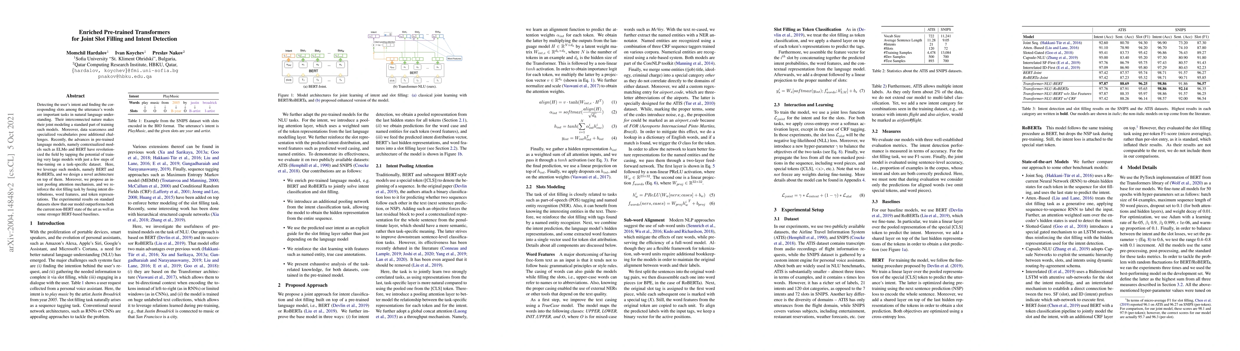 This paper proposes an enriched pre-trained transformer model using BERT and RoBERTa for joint slot filling and intent detection in natural language understanding, incorporating an intent pooling attention mechanism and fusing intent distributions, word features, and token representations. The model outperforms existing non-BERT and BERT-based baselines on standard datasets.