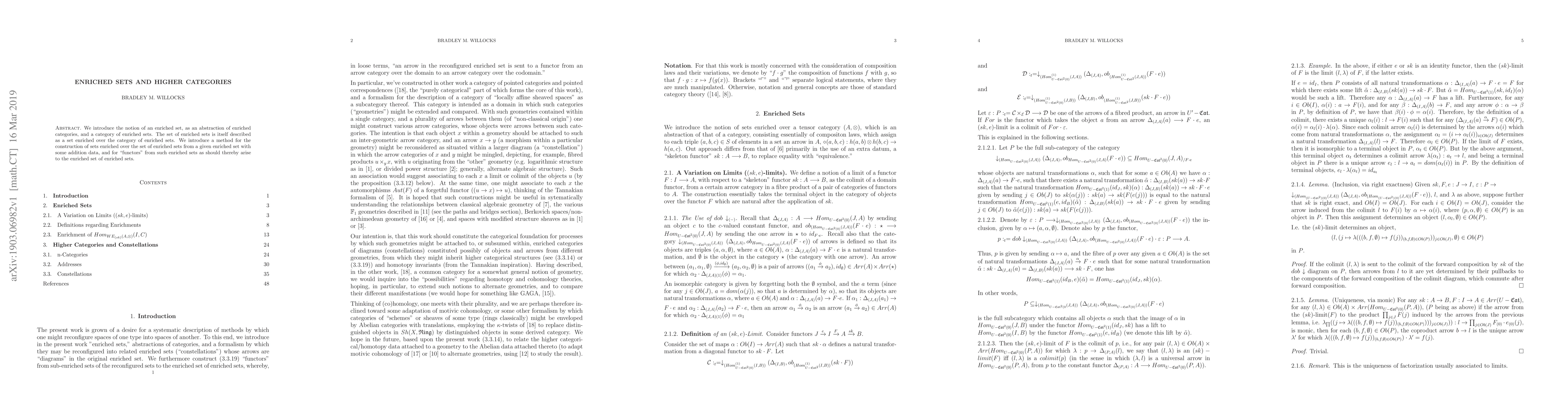 We introduce the notion of an enriched set, as an abstraction of enriched categories, and a category of enriched sets. The set of enriched sets is itself described as a set enriched over the category of enriched sets. We introduce a method for the construction of sets enriched over the set of enriched sets from a given enriched set with some addition data, and for "functors" from such enriched sets as should thereby arise to the enriched set of enriched sets.