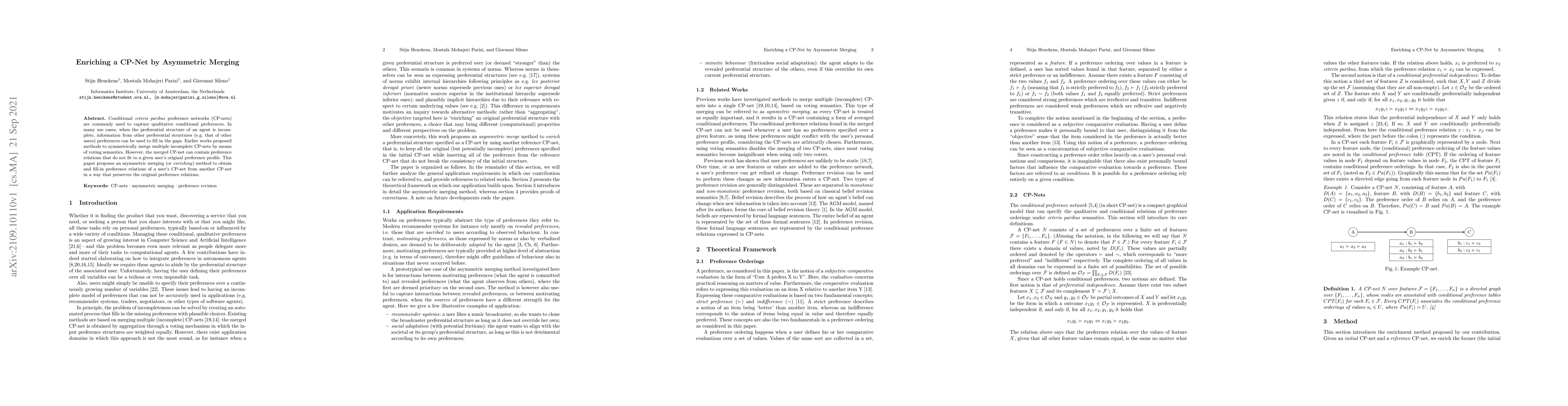 Conditional ceteris paribus preference networks (CP-nets) are commonly used to capture qualitative conditional preferences. In many use cases, when the preferential structure of an agent is incomplete, information from other preferential structures (e.g. that of other users) preferences can be used to fill in the gaps. Earlier works proposed methods to symmetrically merge multiple incomplete CP-nets by means of voting semantics. However, the merged CP-net can contain preference relations that do not fit to a given user's original preference profile. This paper proposes an asymmetric merging (or enriching) method to obtain and fill-in preference relations of a user's CP-net from another CP-net in a way that preserves the original preference relations.