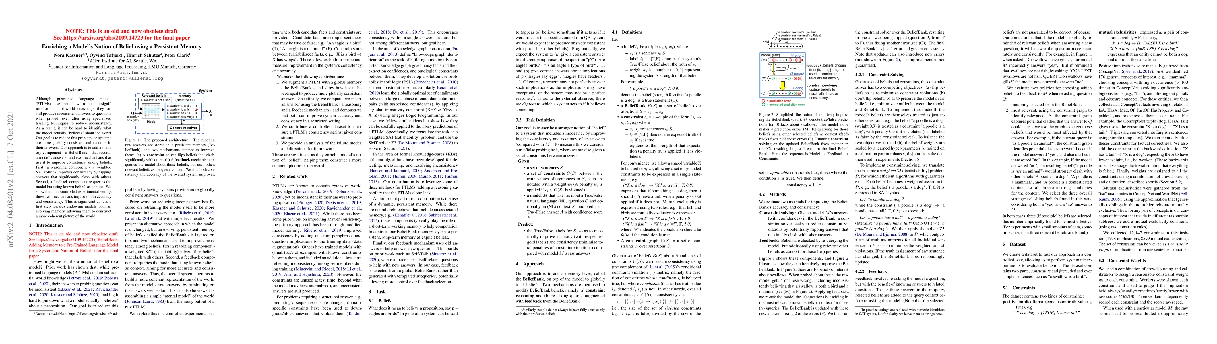 Although pretrained language models (PTLMs) have been shown to contain significant amounts of world knowledge, they can still produce inconsistent answers to questions when probed, even after using specialized training techniques to reduce inconsistency. As a result, it can be hard to identify what the model actually "believes" about the world. Our goal is to reduce this problem, so systems are more globally consistent and accurate in their answers. Our approach is to add a memory component -- a BeliefBank -- that records a model's answers, and two mechanisms that use it to improve consistency among beliefs. First, a reasoning component -- a weighted SAT solver -- improves consistency by flipping answers that significantly clash with others. Second, a feedback component re-queries the model but using known beliefs as context. We show that, in a controlled experimental setting, these two mechanisms improve both accuracy and consistency. This is significant as it is a first step towards endowing models with an evolving memory, allowing them to construct a more coherent picture of the world.