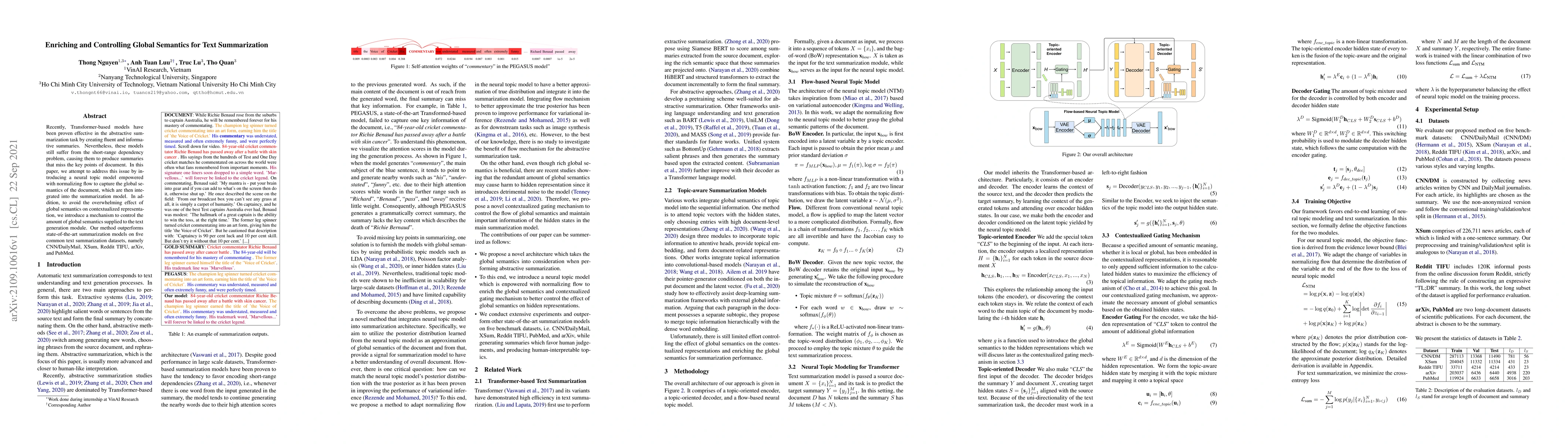 Recently, Transformer-based models have been proven effective in the abstractive summarization task by creating fluent and informative summaries. Nevertheless, these models still suffer from the short-range dependency problem, causing them to produce summaries that miss the key points of document. In this paper, we attempt to address this issue by introducing a neural topic model empowered with normalizing flow to capture the global semantics of the document, which are then integrated into the summarization model. In addition, to avoid the overwhelming effect of global semantics on contextualized representation, we introduce a mechanism to control the amount of global semantics supplied to the text generation module. Our method outperforms state-of-the-art summarization models on five common text summarization datasets, namely CNN/DailyMail, XSum, Reddit TIFU, arXiv, and PubMed.