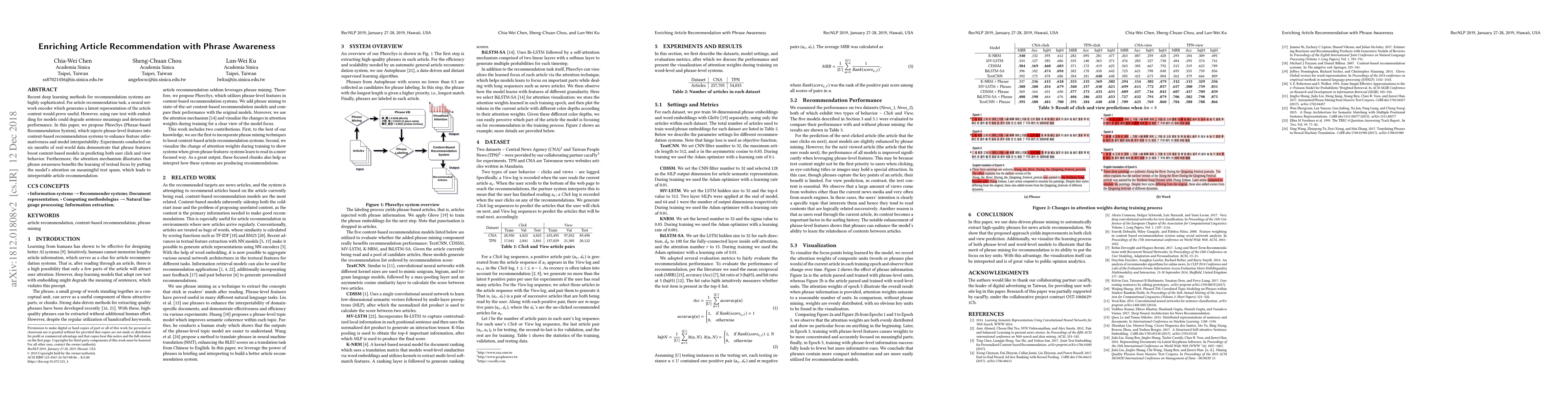 This paper introduces PhrecSys, a Phrase-based Recommendation System that enhances article recommendation by incorporating phrase-level features to improve model performance and interpretability. Experimental results show that phrase features significantly improve predictions of user click and view behavior, with the attention mechanism highlighting the model's focus on meaningful text spans.