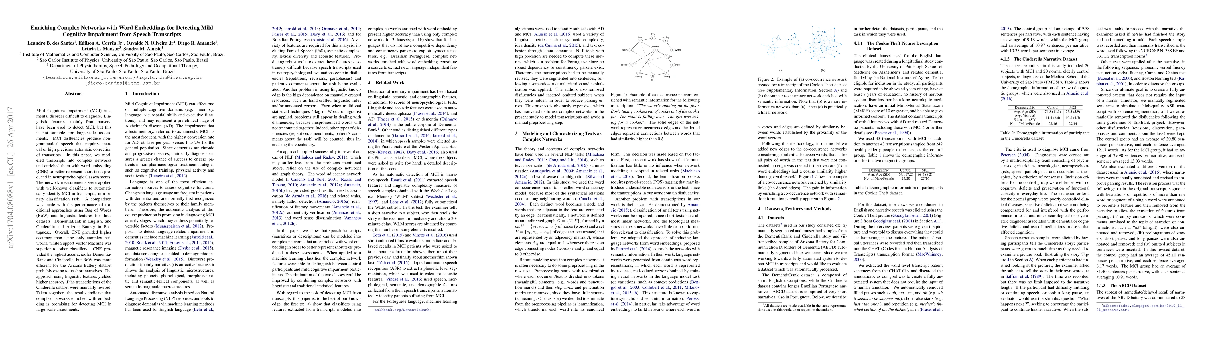 This paper proposes a method to detect Mild Cognitive Impairment (MCI) using complex networks enriched with word embeddings (CNE) to analyze speech transcripts. The CNE approach outperformed traditional Bag of Words (BoW) and linguistic feature methods, especially with Support Vector Machine classifiers, in detecting MCI across multiple datasets.