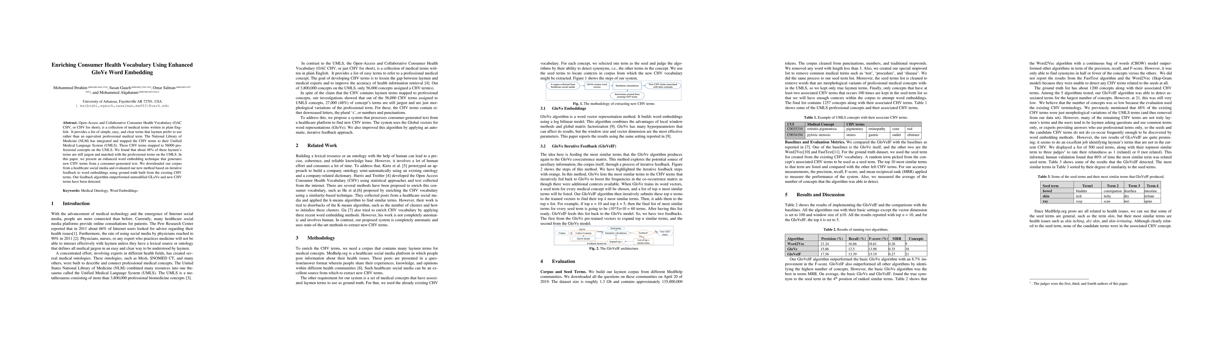 Open-Access and Collaborative Consumer Health Vocabulary (OAC CHV, or CHV for short), is a collection of medical terms written in plain English. It provides a list of simple, easy, and clear terms that laymen prefer to use rather than an equivalent professional medical term. The National Library of Medicine (NLM) has integrated and mapped the CHV terms to their Unified Medical Language System (UMLS). These CHV terms mapped to 56000 professional concepts on the UMLS. We found that about 48% of these laymen's terms are still jargon and matched with the professional terms on the UMLS. In this paper, we present an enhanced word embedding technique that generates new CHV terms from a consumer-generated text. We downloaded our corpus from a healthcare social media and evaluated our new method based on iterative feedback to word embedding using ground truth built from the existing CHV terms. Our feedback algorithm outperformed unmodified GLoVe and new CHV terms have been detected.