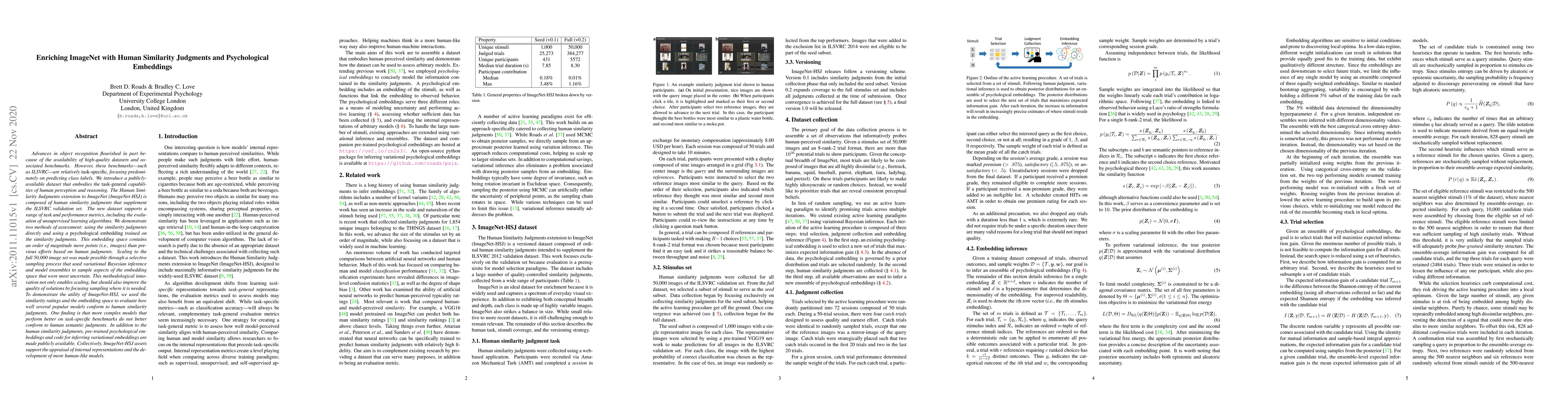 Advances in object recognition flourished in part because of the availability of high-quality datasets and associated benchmarks. However, these benchmarks---such as ILSVRC---are relatively task-specific, focusing predominately on predicting class labels. We introduce a publicly-available dataset that embodies the task-general capabilities of human perception and reasoning. The Human Similarity Judgments extension to ImageNet (ImageNet-HSJ) is composed of human similarity judgments that supplement the ILSVRC validation set. The new dataset supports a range of task and performance metrics, including the evaluation of unsupervised learning algorithms. We demonstrate two methods of assessment: using the similarity judgments directly and using a psychological embedding trained on the similarity judgments. This embedding space contains an order of magnitude more points (i.e., images) than previous efforts based on human judgments. Scaling to the full 50,000 image set was made possible through a selective sampling process that used variational Bayesian inference and model ensembles to sample aspects of the embedding space that were most uncertain. This methodological innovation not only enables scaling, but should also improve the quality of solutions by focusing sampling where it is needed. To demonstrate the utility of ImageNet-HSJ, we used the similarity ratings and the embedding space to evaluate how well several popular models conform to human similarity judgments. One finding is that more complex models that perform better on task-specific benchmarks do not better conform to human semantic judgments. In addition to the human similarity judgments, pre-trained psychological embeddings and code for inferring variational embeddings are made publicly available. Collectively, ImageNet-HSJ assets support the appraisal of internal representations and the development of more human-like models.