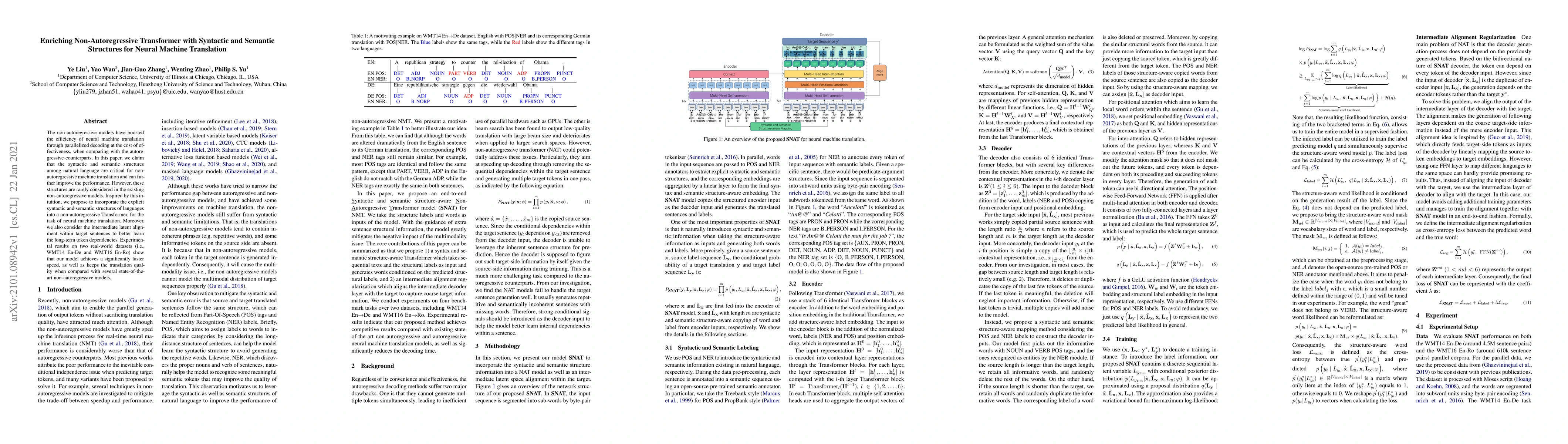 This paper proposes a method to enhance non-autoregressive Transformers for neural machine translation by incorporating explicit syntactic and semantic structures, along with intermediate latent alignment, achieving faster speeds and comparable translation quality to state-of-the-art autoregressive models. Experiments on WMT14 En-De and WMT16 En-Ro datasets validate these improvements.