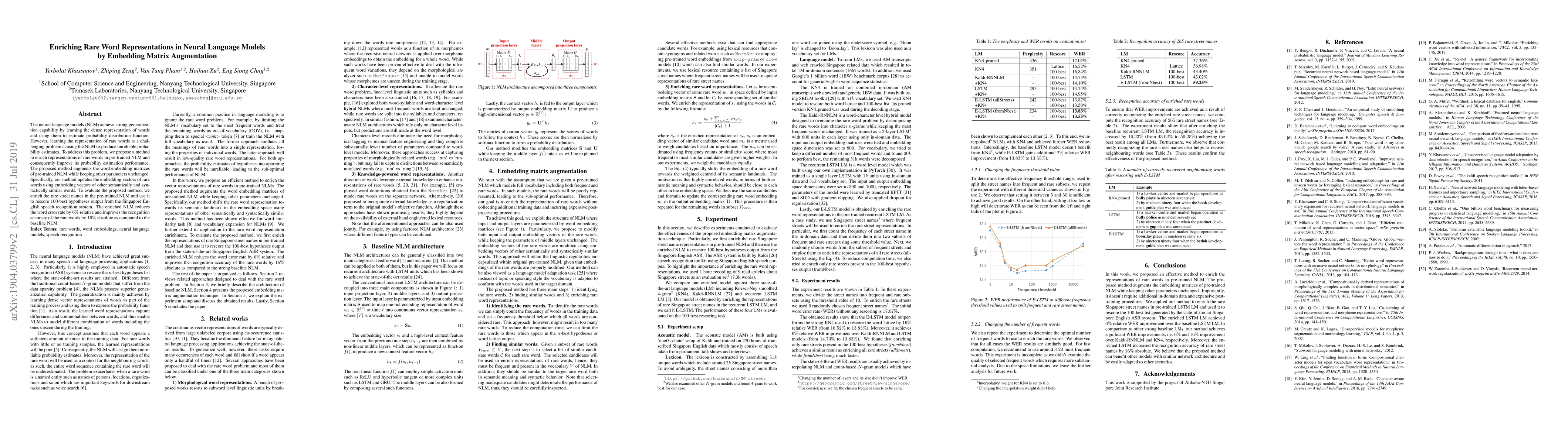 This paper proposes a method to enhance the representation of rare words in neural language models (NLM) by augmenting the word embedding matrices. The enriched NLM shows a 6% relative reduction in word error rate and a 16% absolute improvement in recognition accuracy of rare words compared to the baseline model.