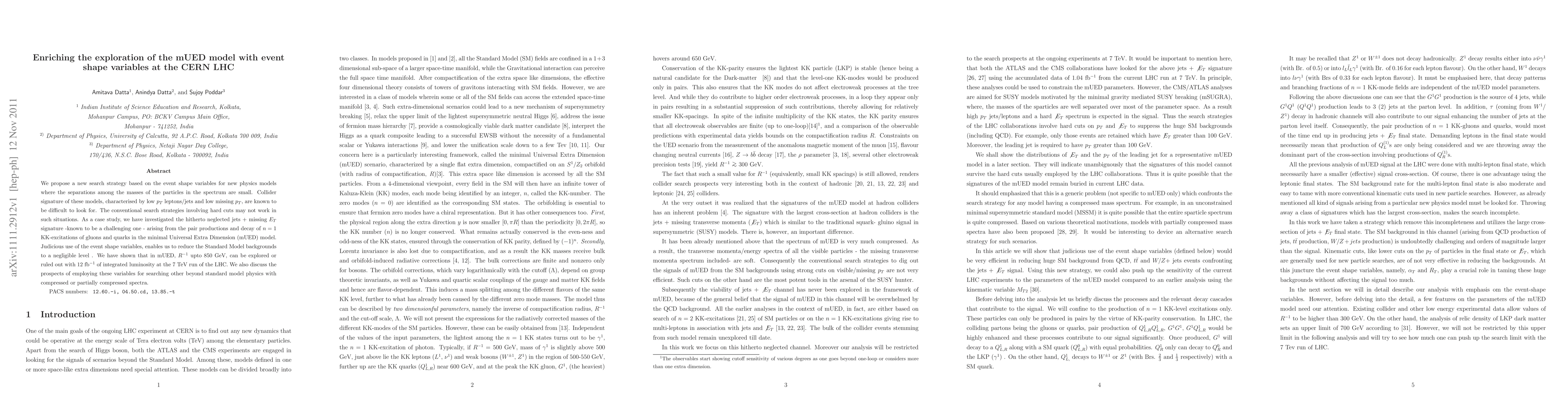 We propose a new search strategy based on the event shape variables for new physics models where the separations among the masses of the particles in the spectrum are small. Collider signature of these models, characterised by low $p_T$ leptons/jets and low missing $p_T$, are known to be difficult to look for. The conventional search strategies involving hard cuts may not work in such situations. As a case study, we have investigated the hitherto neglected jets + missing $E_T$ signature -known to be a challenging one - arising from the pair productions and decay of $n =1$ KK-excitations of gluons and quarks in the minimal Universal Extra Dimension (mUED) model. Judicious use of the event shape variables, enables us to reduce the Standard Model backgrounds to a negligible level . We have shown that in mUED, $R^{-1}$ upto $850 ~\rm GeV$, can be explored or ruled out with 12 fb$^{-1}$ of integrated luminosity at the 7 TeV run of the LHC. We also discuss the prospects of employing these variables for searching other beyond standard model physics with compressed or partially compressed spectra.