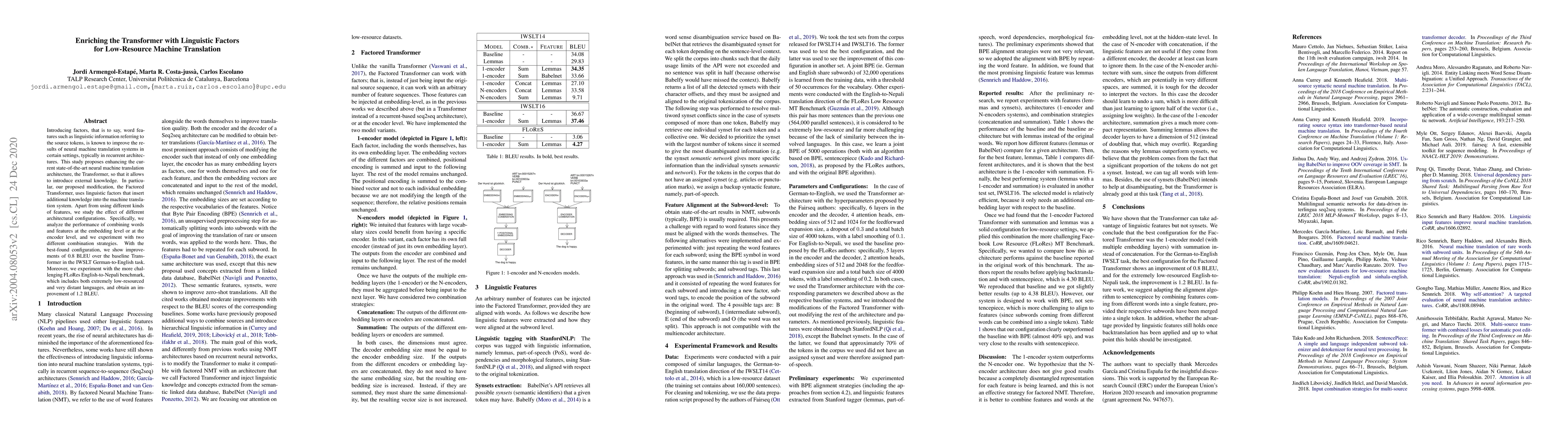 This paper proposes a Factored Transformer architecture to incorporate linguistic factors into the Transformer model for improved low-resource machine translation. The study finds that integrating linguistic features, such as word embeddings, at either the embedding or encoder level can enhance translation quality, achieving up to 0.8 BLEU improvement on German-to-English and 1.2 BLEU on English-to-Nepali translations.