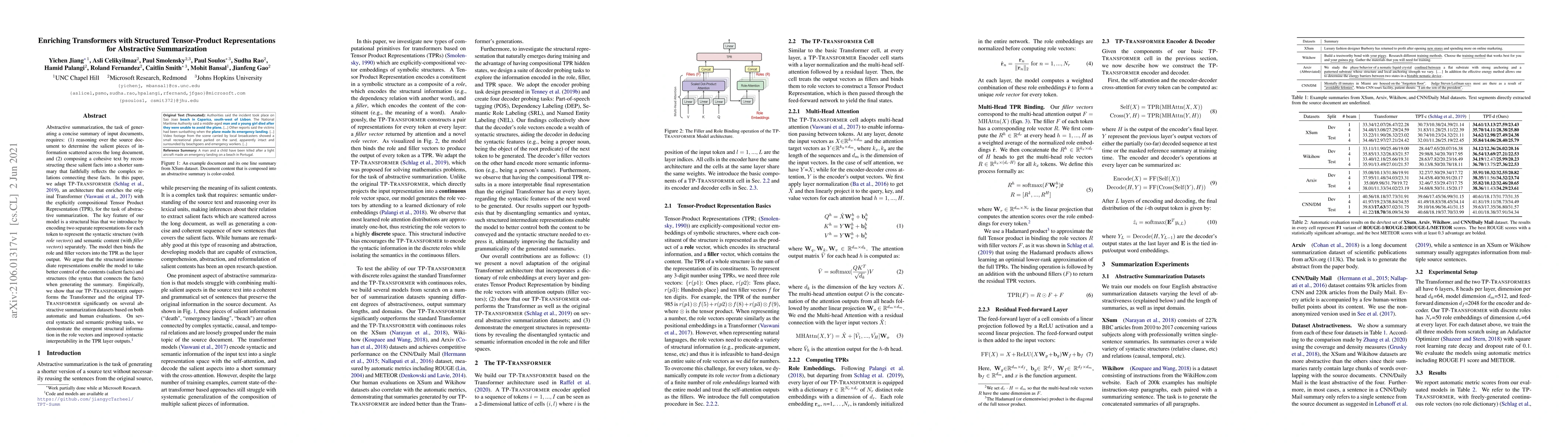 This paper adapts the TP-TRANSFORMER architecture to enhance abstractive summarization by encoding separate representations for syntactic structure and semantic content, which are then combined into Tensor Product Representations. The model shows significant improvements over standard Transformers in summarization tasks, demonstrating better syntactic and semantic understanding.