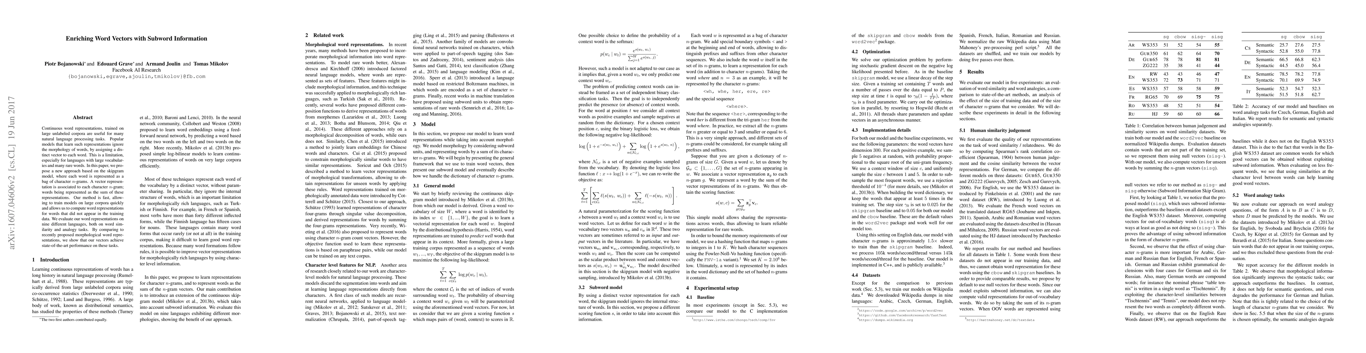 Continuous word representations, trained on large unlabeled corpora are useful for many natural language processing tasks. Popular models that learn such representations ignore the morphology of words, by assigning a distinct vector to each word. This is a limitation, especially for languages with large vocabularies and many rare words. In this paper, we propose a new approach based on the skipgram model, where each word is represented as a bag of character $n$-grams. A vector representation is associated to each character $n$-gram; words being represented as the sum of these representations. Our method is fast, allowing to train models on large corpora quickly and allows us to compute word representations for words that did not appear in the training data. We evaluate our word representations on nine different languages, both on word similarity and analogy tasks. By comparing to recently proposed morphological word representations, we show that our vectors achieve state-of-the-art performance on these tasks.
