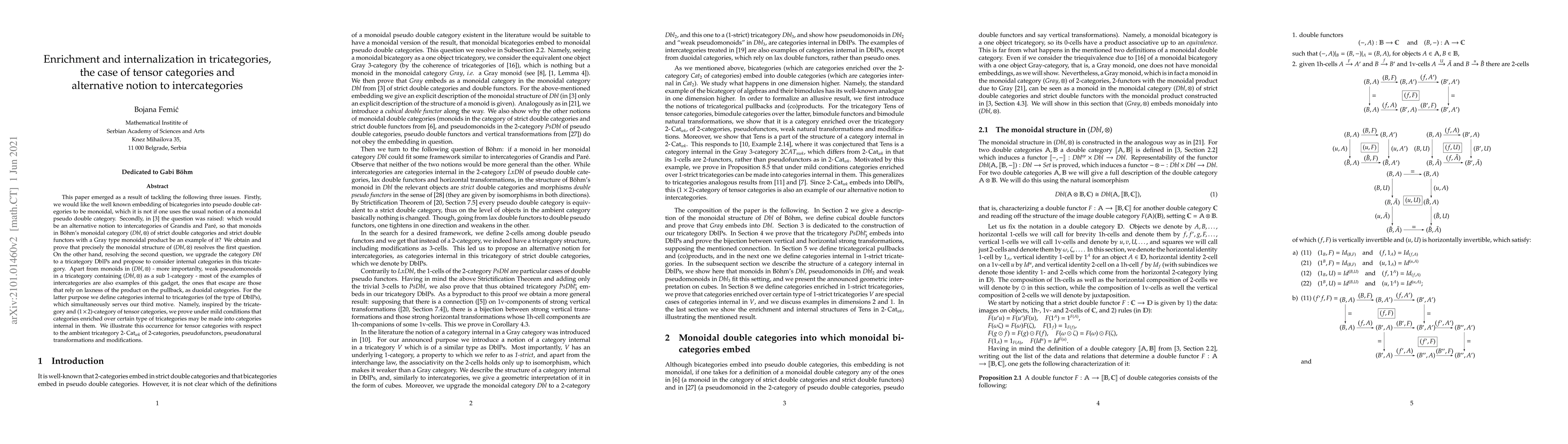 This paper emerged as a result of tackling the following three issues. Firstly, we would like the well known embedding of bicategories into pseudo double categories to be monoidal, which it is not if one uses the usual notion of a monoidal pseudo double category. Secondly, in \cite{Gabi} the question was raised: which would be an alternative notion to intercategories of Grandis and Par\'e, so that monoids in B\"ohm's monoidal category $(Dbl,\ot)$ of strict double categories and strict double functors with a Gray type monoidal product be an example of it? We obtain and prove that precisely the monoidal structure of $(Dbl,\ot)$ resolves the first question. On the other hand, resolving the second question, we upgrade the category $Dbl$ to a tricategory $\DblPs$ and propose %an alternative definition of intercategories as to consider internal categories in this tricategory. %, enabling monoids in $(Dbl,\ot)$ to be examples of this gadget. Apart from monoids in $(Dbl,\ot)$ - more importanlty, weak pseudomonoids in a tricategory containing $(Dbl,\ot)$ as a sub 1-category - most of the examples of intercategories are also examples of this gadget, the ones that escape are those that rely on laxness of the product on the pullback, as duoidal categories. For the latter purpose we define categories internal to tricategories (of the type of $\DblPs$), which simultaneously serves our third motive. Namely, inspired by the tricategory and $(1\times 2)$-category of tensor categories, we prove under mild conditions that categories enriched over certain type of tricategories may be made into categories internal in them. We illustrate this occurrence for tensor categories with respect to the ambient tricategory $2\x\Cat_{wk}$ of 2-categories, pseudofunctors, pseudonatural transformations and modifications.