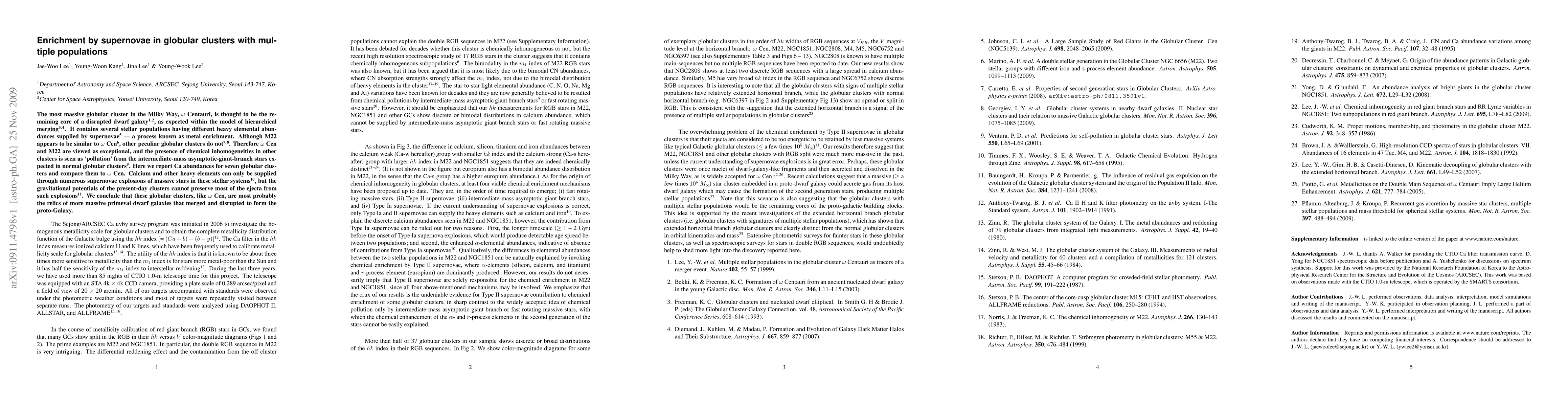 This paper investigates the enrichment of globular clusters by supernovae, focusing on omega Centauri and M22, which exhibit multiple stellar populations with distinct heavy element abundances. The study concludes that these clusters likely originated from disrupted, more massive primeval dwarf galaxies, enriched by numerous supernovae, unlike typical globular clusters.