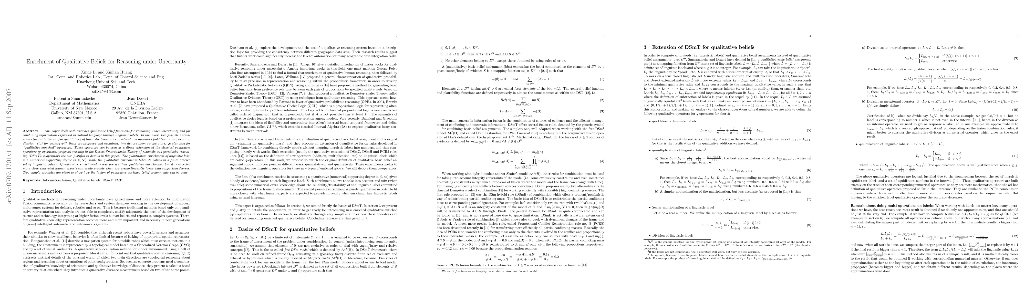 This paper proposes enriched qualitative belief functions with $qe$-operators for reasoning under uncertainty, combining information from linguistic labels. It explores both quantitative and qualitative enrichments of these labels, extending classical qualitative operators from the Dezert-Smarandache Theory, with two examples demonstrating the fusion of qualitative-enriched belief assignments.