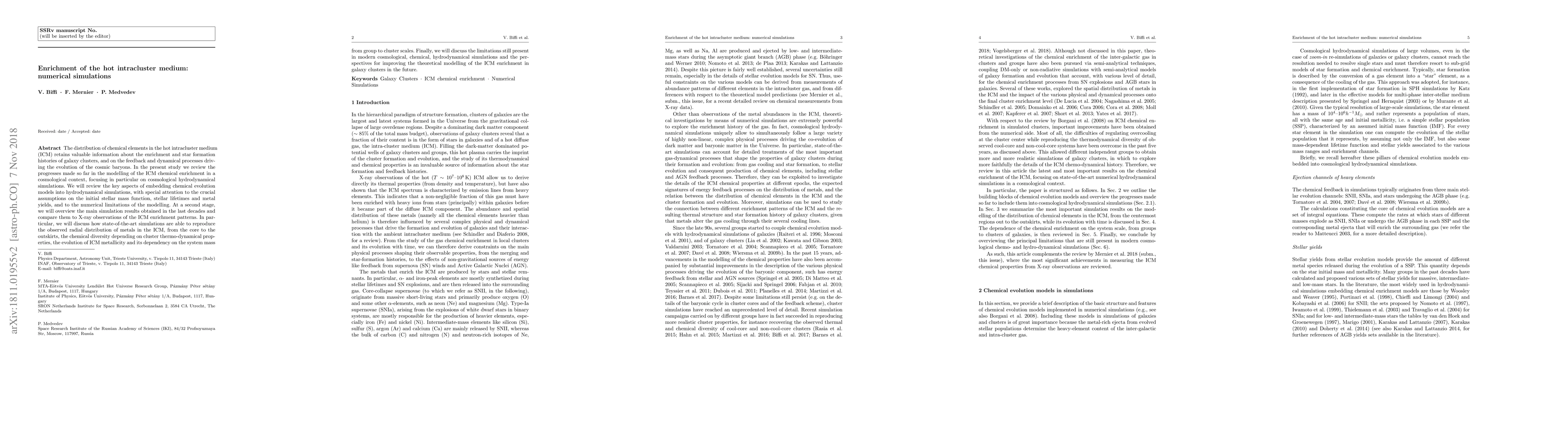 This paper reviews advancements in modeling the chemical enrichment of the hot intracluster medium (ICM) using cosmological hydrodynamical simulations, focusing on assumptions and limitations in stellar evolution models. It compares simulation results with X-ray observations, highlighting the ability to reproduce observed metal distributions and chemical diversity, while also discussing current limitations and future improvements.