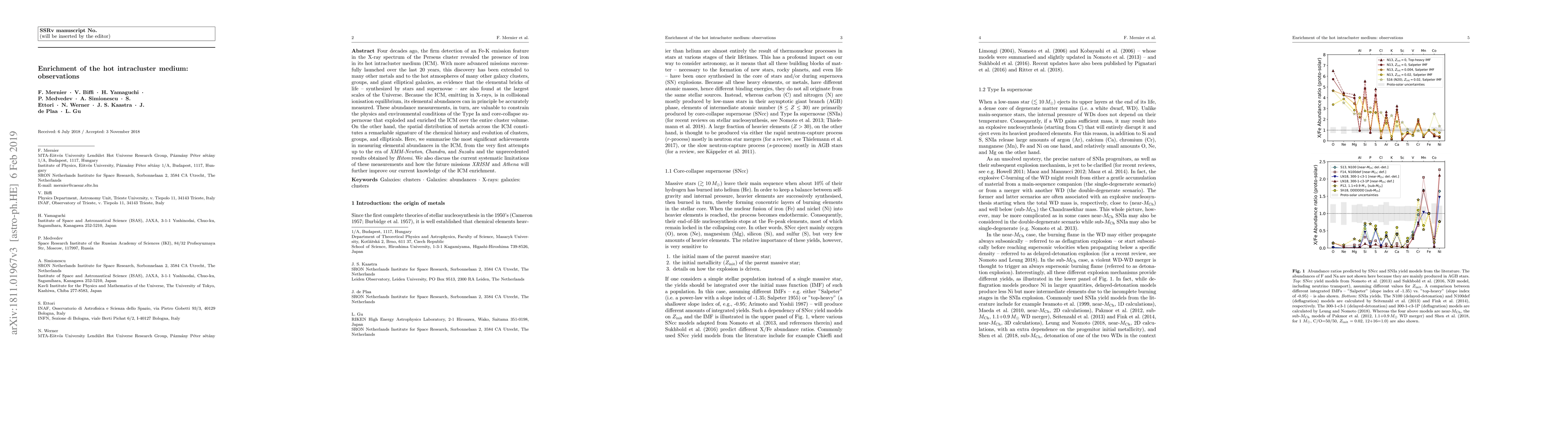 Four decades ago, the firm detection of an Fe-K emission feature in the X-ray spectrum of the Perseus cluster revealed the presence of iron in its hot intracluster medium (ICM). With more advanced missions successfully launched over the last 20 years, this discovery has been extended to many other metals and to the hot atmospheres of many other galaxy clusters, groups, and giant elliptical galaxies, as evidence that the elemental bricks of life - synthesized by stars and supernovae - are also found at the largest scales of the Universe. Because the ICM, emitting in X-rays, is in collisional ionisation equilibrium, its elemental abundances can in principle be accurately measured. These abundance measurements, in turn, are valuable to constrain the physics and environmental conditions of the Type Ia and core-collapse supernovae that exploded and enriched the ICM over the entire cluster volume. On the other hand, the spatial distribution of metals across the ICM constitutes a remarkable signature of the chemical history and evolution of clusters, groups, and ellipticals. Here, we summarise the most significant achievements in measuring elemental abundances in the ICM, from the very first attempts up to the era of XMM-Newton, Chandra, and Suzaku and the unprecedented results obtained by Hitomi. We also discuss the current systematic limitations of these measurements and how the future missions XRISM and Athena will further improve our current knowledge of the ICM enrichment.