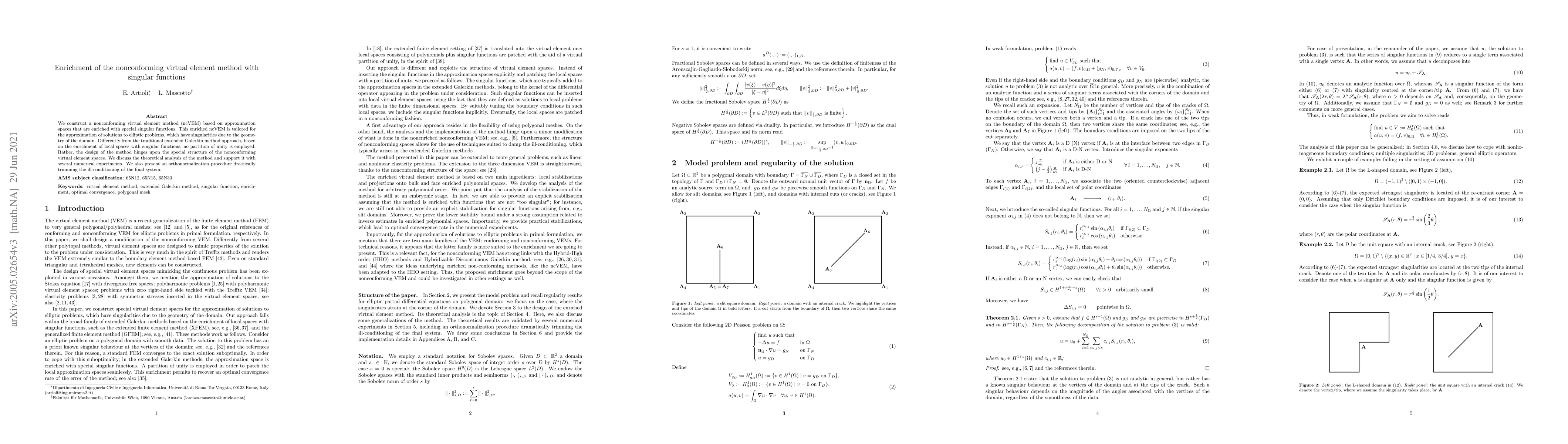 We construct a nonconforming virtual element method (ncVEM) based on approximation spaces that are enriched with special singular functions. This enriched ncVEM is tailored for the approximation of solutions to elliptic problems, which have singularities due to the geometry of the domain. Differently from the traditional extended Galerkin method approach, based on the enrichment of local spaces with singular functions, no partition of unity is employed. Rather, the design of the method hinges upon the special structure of the nonconforming virtual element spaces. We discuss the theoretical analysis of the method and support it with several numerical experiments. We also present an orthonormalization procedure drastically trimming the ill-conditioning of the final system.