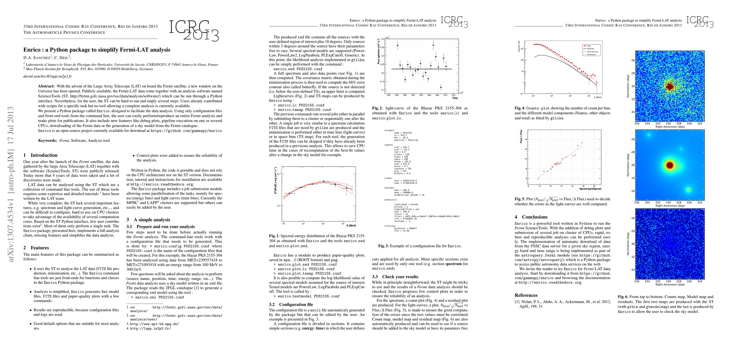 Enrico is a Python package designed to simplify Fermi-LAT data analysis by providing an easy-to-use interface for running the ScienceTools software. It allows users to perform complete Fermi analysis and generate publication-ready plots using configuration files and command-line tools.