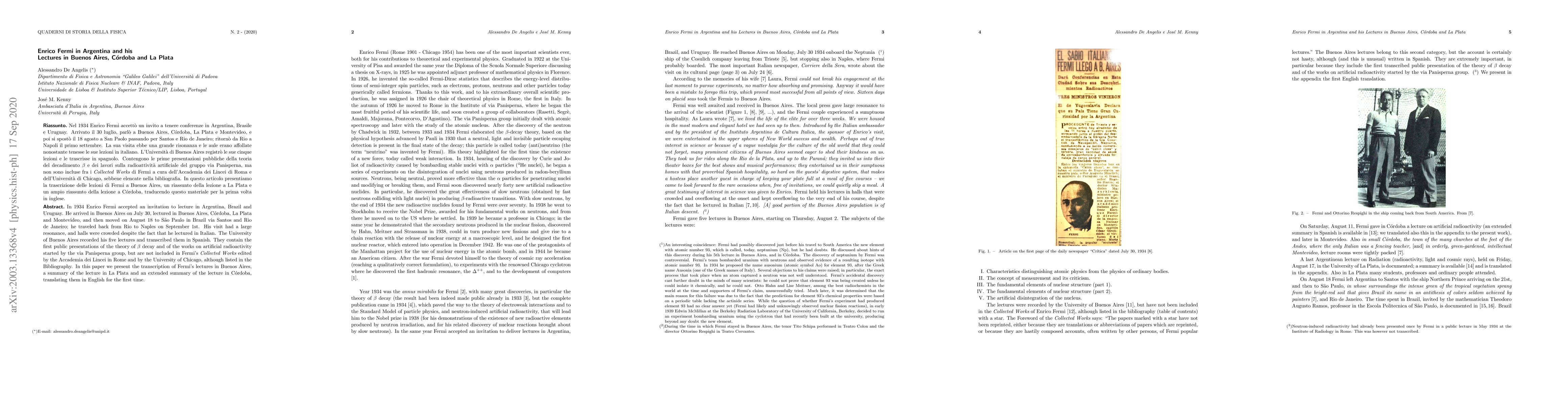 This paper details Enrico Fermi's 1934 lecture tour in Argentina, focusing on his five lectures in Buenos Aires, a summary of his lecture in La Plata, and an extended summary of his lecture in Cordoba. These lectures, delivered in Italian, introduced groundbreaking concepts in beta decay and artificial radioactivity.