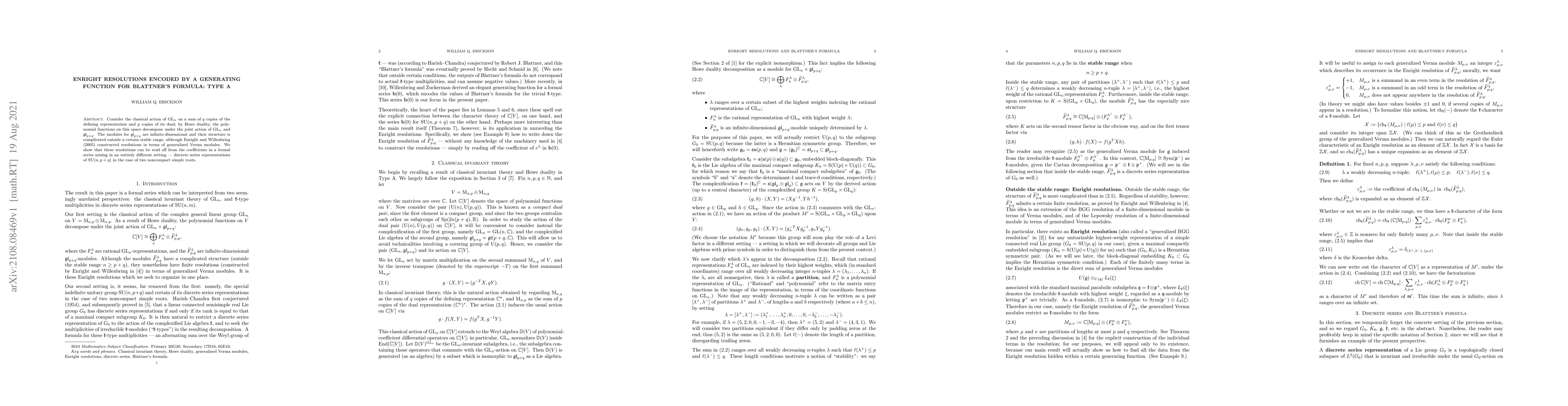Consider the classical action of ${\rm GL}_n$ on a sum of $q$ copies of the defining representation and $p$ copies of its dual; by Howe duality, the polynomial functions on this space decompose under the joint action of ${\rm GL}_n$ and $\mathfrak{gl}_{p+q}$. The modules for $\mathfrak{gl}_{p+q}$ are infinite-dimensional and their structure is complicated outside a certain stable range, although Enright and Willenbring (2005) constructed resolutions in terms of generalized Verma modules. We show that these resolutions can be read off from the coefficients in a formal series arising in an entirely different setting: discrete series representations of ${\rm SU}(n,p+q)$ in the case of two noncompact simple roots.