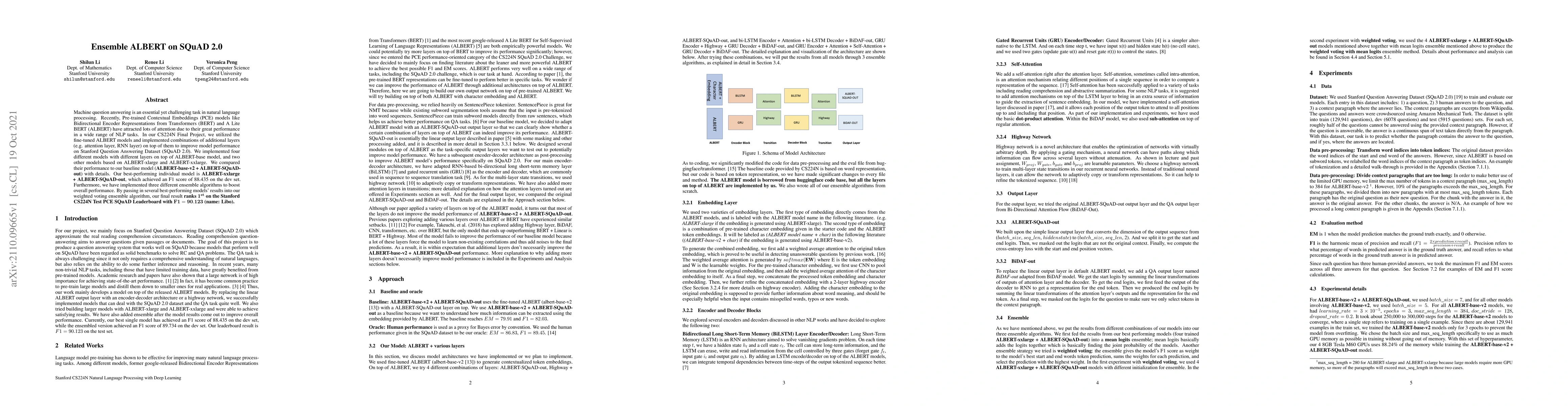 This paper explores enhancing the performance of ALBERT models on the SQuAD 2.0 dataset by adding various layers and employing ensemble techniques. The best-performing ensemble model achieved an F1 score of 90.123, ranking first on the leaderboard.