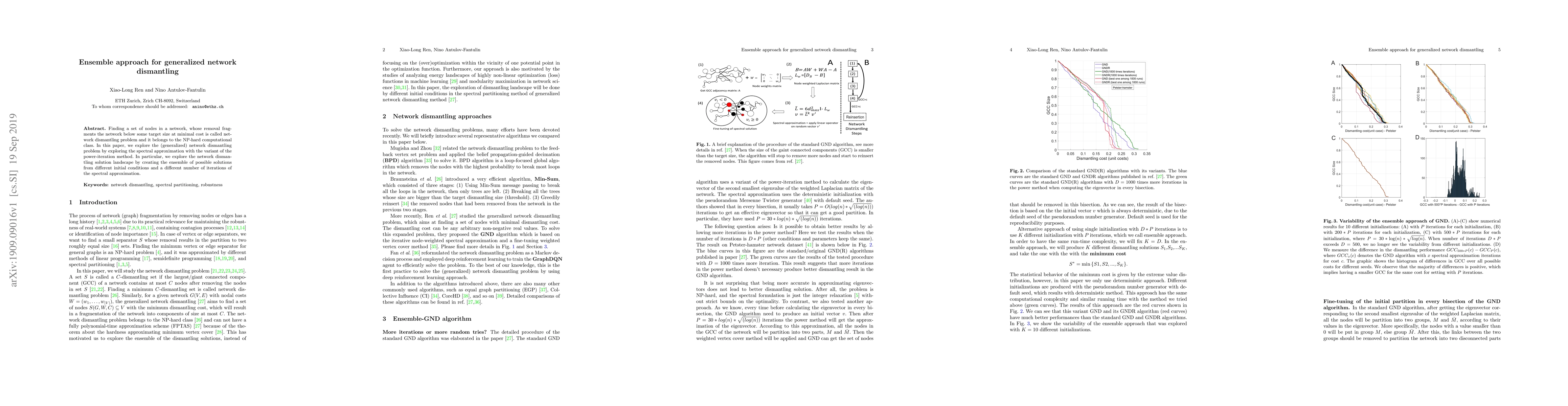 This paper investigates the generalized network dismantling problem using an ensemble approach based on spectral approximation and power-iteration methods. The study generates diverse solutions by varying initial conditions and iteration counts to find minimal-cost node sets that fragment the network to a target size.