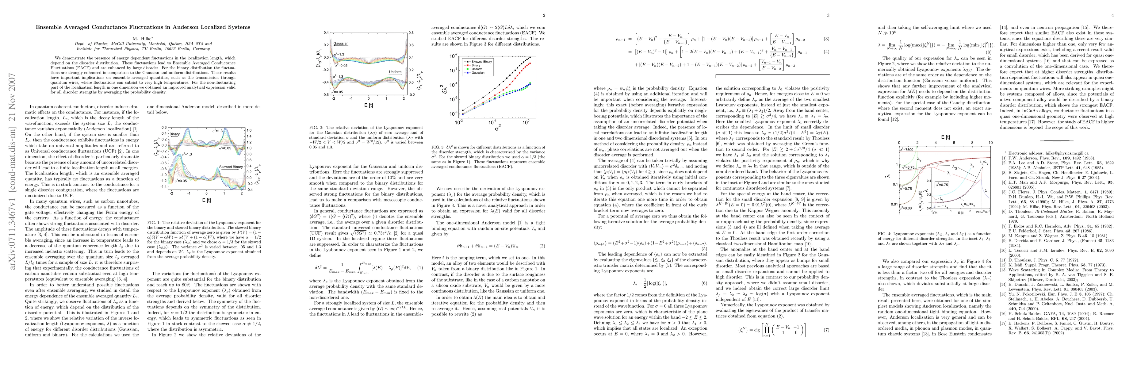 We demonstrate the presence of energy dependent fluctuations in the localization length, which depend on the disorder distribution. These fluctuations lead to Ensemble Averaged Conductance Fluctuations (EACF) and are enhanced by large disorder. For the binary distribution the fluctuations are strongly enhanced in comparison to the Gaussian and uniform distributions. These results have important implications on ensemble averaged quantities, such as the transmission through quantum wires, where fluctuations can subsist to very high temperatures. For the non-fluctuating part of the localization length in one dimension we obtained an improved analytical expression valid for all disorder strengths by averaging the probability density.