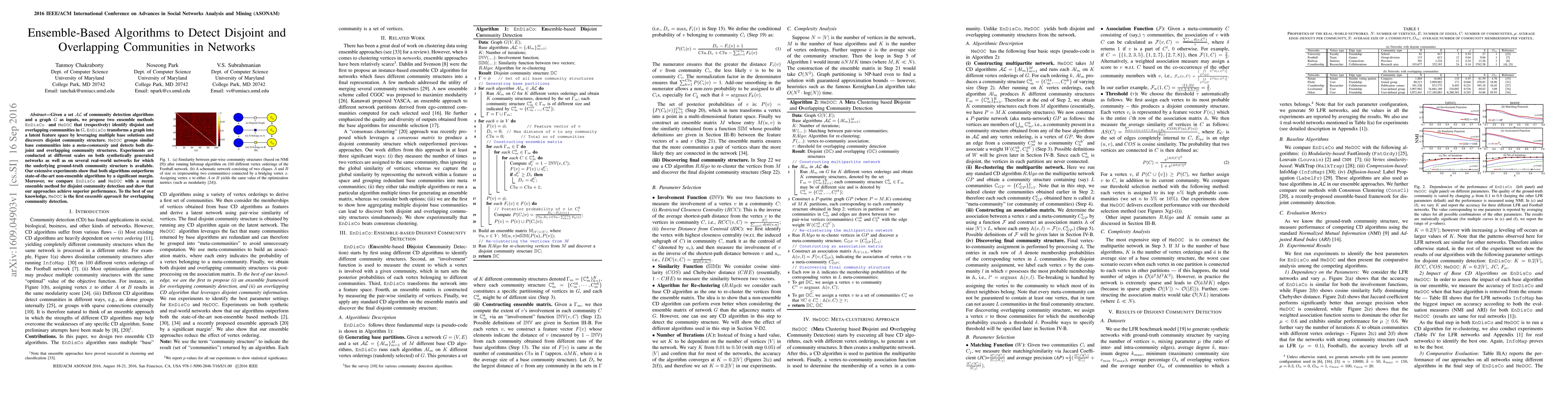Given a set ${\cal AL}$ of community detection algorithms and a graph $G$ as inputs, we propose two ensemble methods $\mathtt{EnDisCO}$ and $\mathtt{MeDOC}$ that (respectively) identify disjoint and overlapping communities in $G$. $\mathtt{EnDisCO}$ transforms a graph into a latent feature space by leveraging multiple base solutions and discovers disjoint community structure. $\mathtt{MeDOC}$ groups similar base communities into a meta-community and detects both disjoint and overlapping community structures. Experiments are conducted at different scales on both synthetically generated networks as well as on several real-world networks for which the underlying ground-truth community structure is available. Our extensive experiments show that both algorithms outperform state-of-the-art non-ensemble algorithms by a significant margin. Moreover, we compare $\mathtt{EnDisCO}$ and $\mathtt{MeDOC}$ with a recent ensemble method for disjoint community detection and show that our approaches achieve superior performance. To the best of our knowledge, $\mathtt{MeDOC}$ is the first ensemble approach for overlapping community detection.