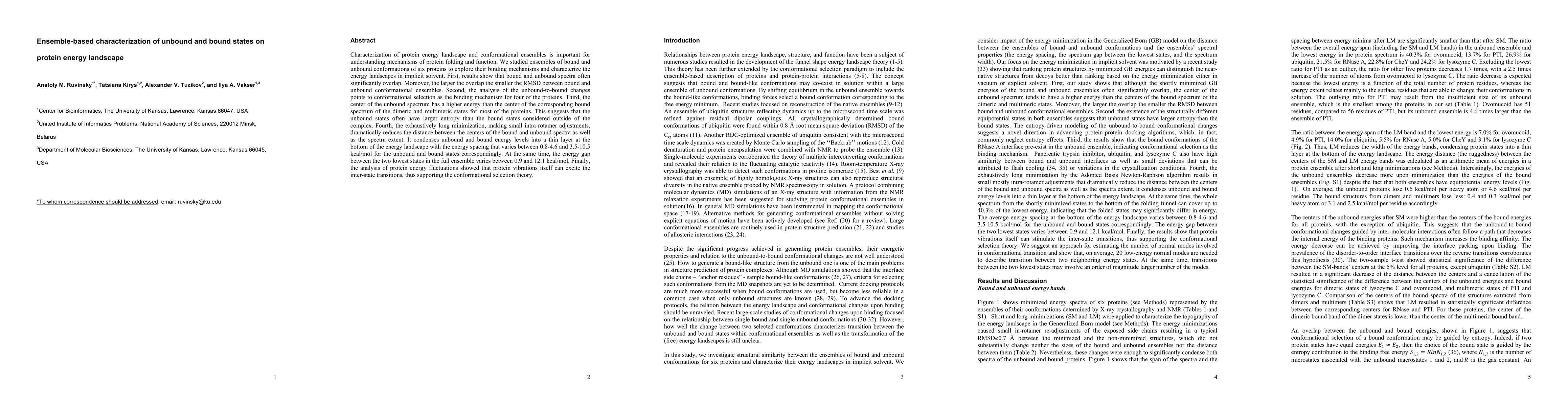 Characterization of protein energy landscape and conformational ensembles is important for understanding mechanisms of protein folding and function. We studied ensembles of bound and unbound conformations of six proteins to explore their binding mechanisms and characterize the energy landscapes in implicit solvent. First, results show that bound and unbound spectra often significantly overlap. Moreover, the larger the overlap the smaller the RMSD between bound and unbound conformational ensembles. Second, the analysis of the unbound-to-bound changes points to conformational selection as the binding mechanism for four of the proteins. Third, the center of the unbound spectrum has a higher energy than the center of the corresponding bound spectrum of the dimeric and multimeric states for most of the proteins. This suggests that the unbound states often have larger entropy than the bound states considered outside of the complex. Fourth, the exhaustively long minimization, making small intra-rotamer adjustments, dramatically reduces the distance between the centers of the bound and unbound spectra as well as the spectra extent. It condenses unbound and bound energy levels into a thin layer at the bottom of the energy landscape with the energy spacing that varies between 0.8-4.6 and 3.5-10.5 kcal/mol for the unbound and bound states correspondingly. At the same time, the energy gap between the two lowest states in the full ensemble varies between 0.9 and 12.1 kcal/mol. Finally, the analysis of protein energy fluctuations showed that protein vibrations itself can excite the inter-state transitions, thus supporting the conformational selection theory.
