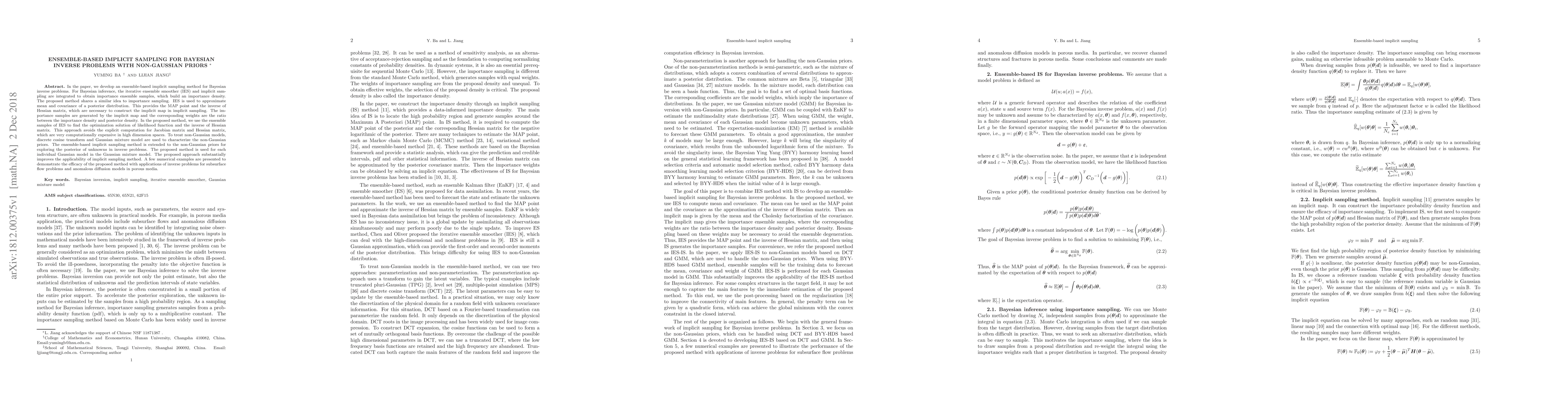 This paper proposes an ensemble-based implicit sampling method for Bayesian inverse problems, integrating iterative ensemble smoother and implicit sampling to generate importance samples efficiently. The method avoids computationally expensive Jacobian and Hessian matrix calculations, and extends to non-Gaussian priors using discrete cosine transform and Gaussian mixture models, demonstrating improved applicability and efficacy through subsurface flow and anomalous diffusion applications.