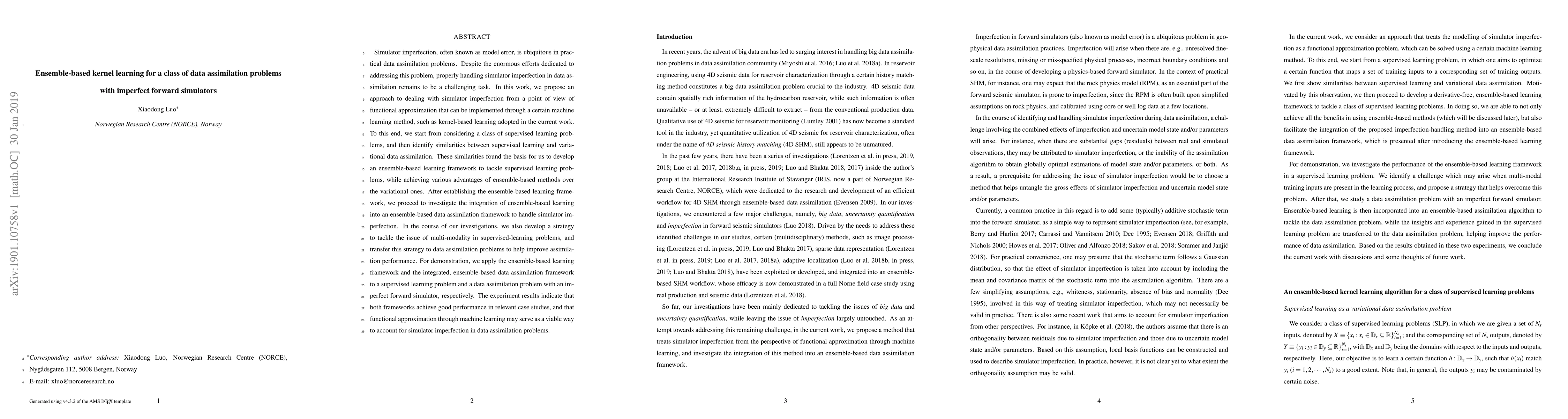 This paper proposes an ensemble-based kernel learning approach to address simulator imperfection in data assimilation problems. It integrates machine learning methods into an ensemble-based data assimilation framework, demonstrating improved performance in handling model errors and multi-modality issues.