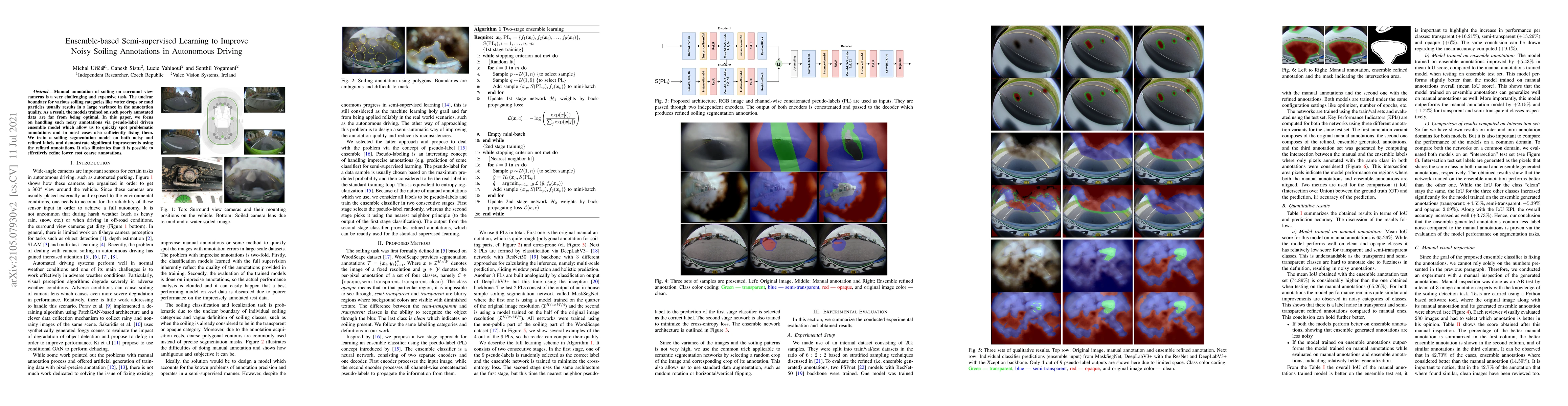 This paper proposes an ensemble-based semi-supervised learning approach to improve soiling annotations in autonomous driving by addressing noisy labels. The method uses pseudo-labeling to identify and correct problematic annotations, leading to significant improvements in soiling segmentation models trained on the refined data.